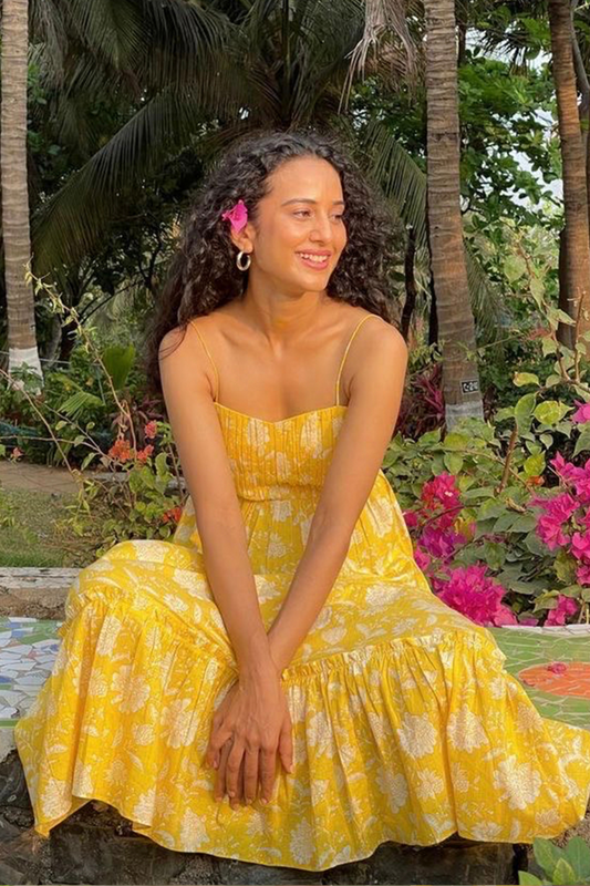 Yellow Floral Hand-printed Soft Cotton Sundress with Pocket