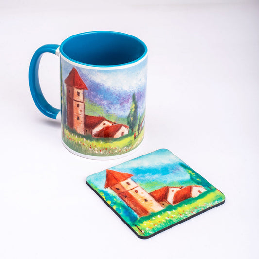 Countryside Landscape Mug with Coaster - Blue