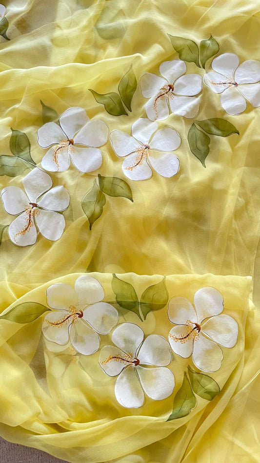 Hibiscus Chiffon Saree In Yellow Base