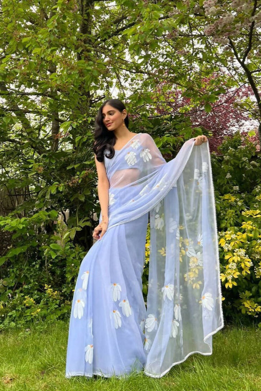 Ash Blue Half-Daisies Chiffon Saree