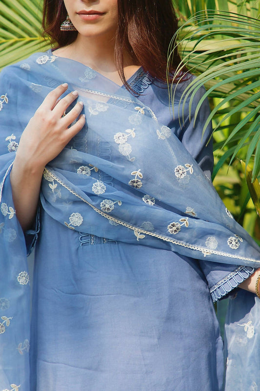 Pastel Pink Kurta Set With Floral Embroidered Organza Dupatta