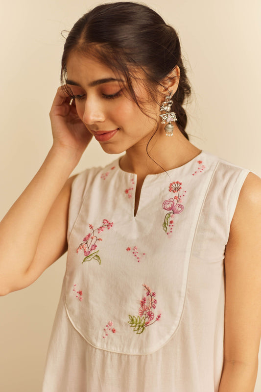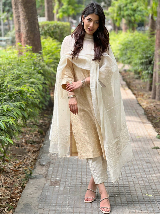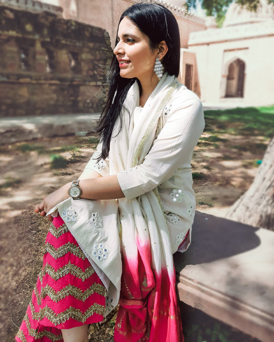 Off White And Pink Cotton Set With Dual Shade Mukeish Work Chanderi Dupatta
