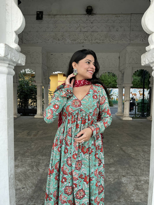 Rukami Handblock Printed Cotton Anarkali Suit