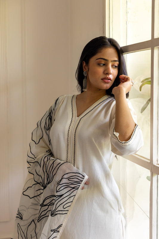 Off-white Cotton Black Embroidered Kurta Set