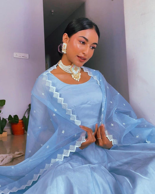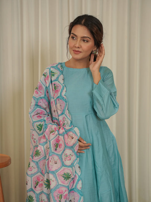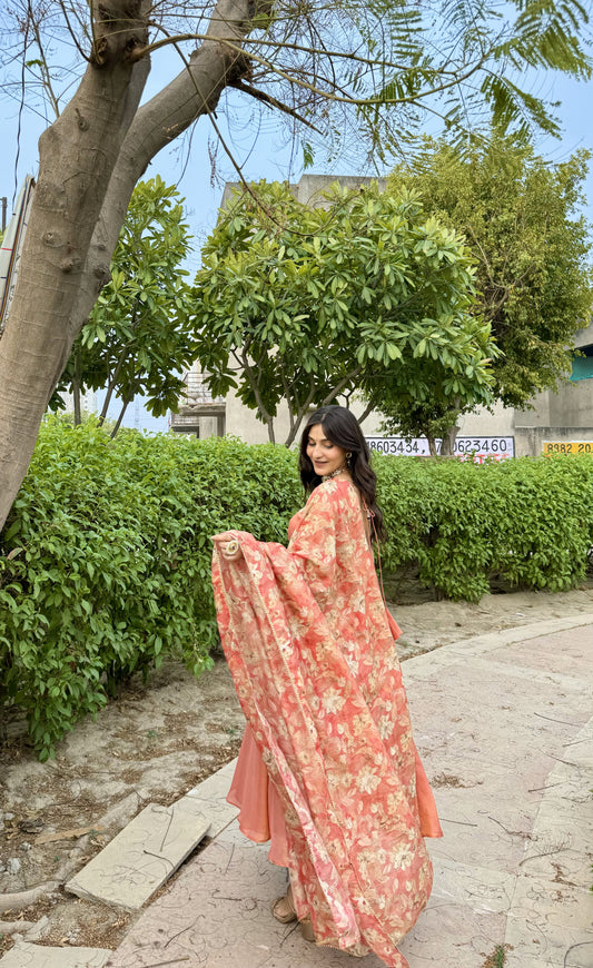 Jaana Pink Chanderi Anarkali Suit with Aari Embroidery & Digital Print Floral Jaal Dupatta