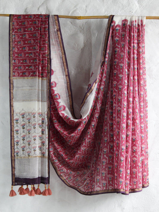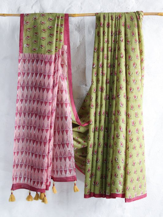 Indigo Bouquet - Dabu Hand Block Print Mulmul Cotton Bagru Saree