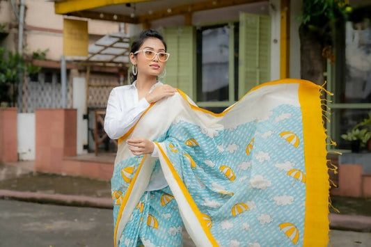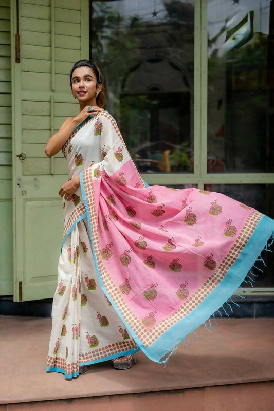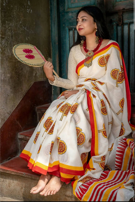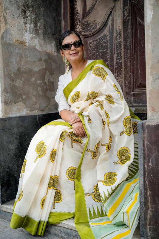 Indigo Hibiscus - Hand Block Print Mulmul Cotton Bagru Saree
