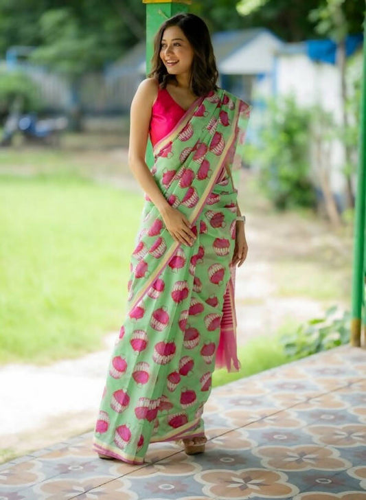 Drizzle in Backyard - Hand Block Print Mulmul Cotton Bagru Saree