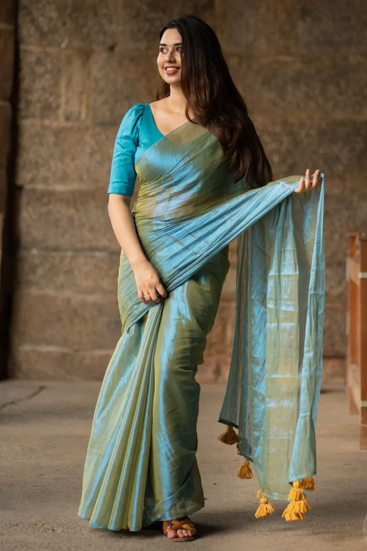 Metallic Zari tissue Saree With Handmade Tassels