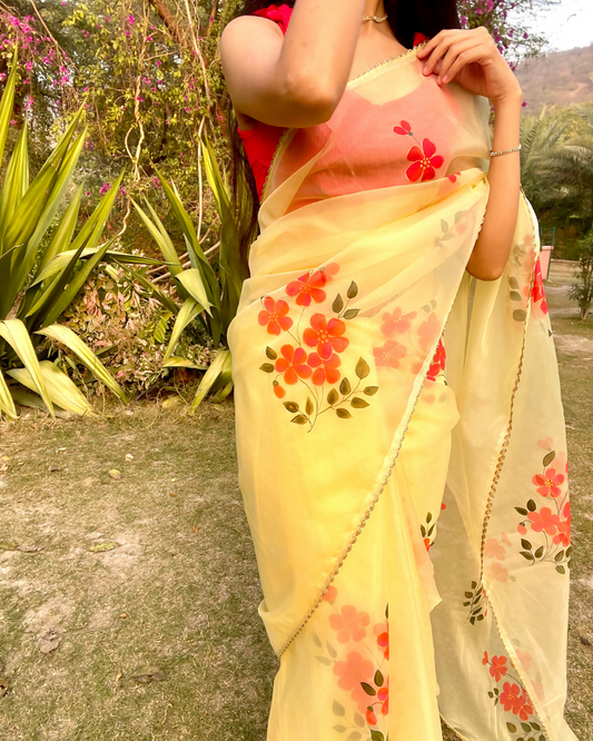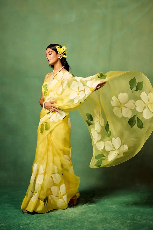 Kiran Flora Hand Pinted Sequins Saree In Yellow