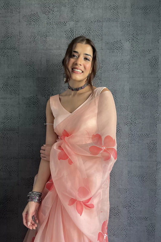 Topaz Teal Aarzoo Handpainted Organza Saree