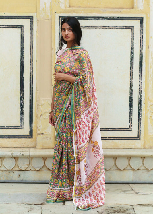 Garden of Secrets - Hand Block Print Chanderi Silk Saree