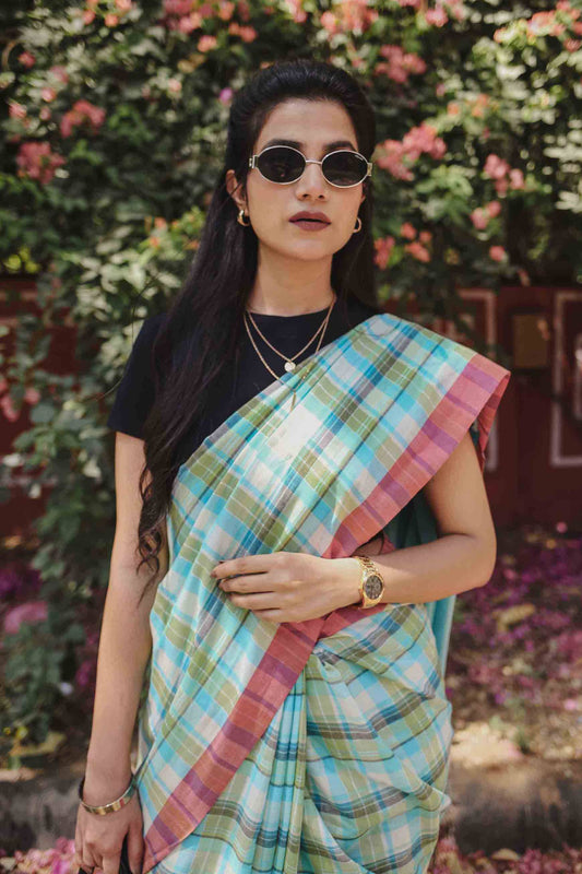 On the Clock - Turquoise & Green Checked Organic Cotton Saree