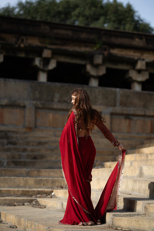 Sindoori Red Mirror Work Pre-stiched Saree