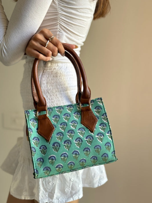 Mini Green Handblock Printed Tote Sling Bag
