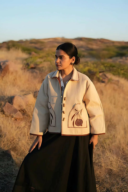 Beige Rhyme Front button Pocket Embroidered Jacket