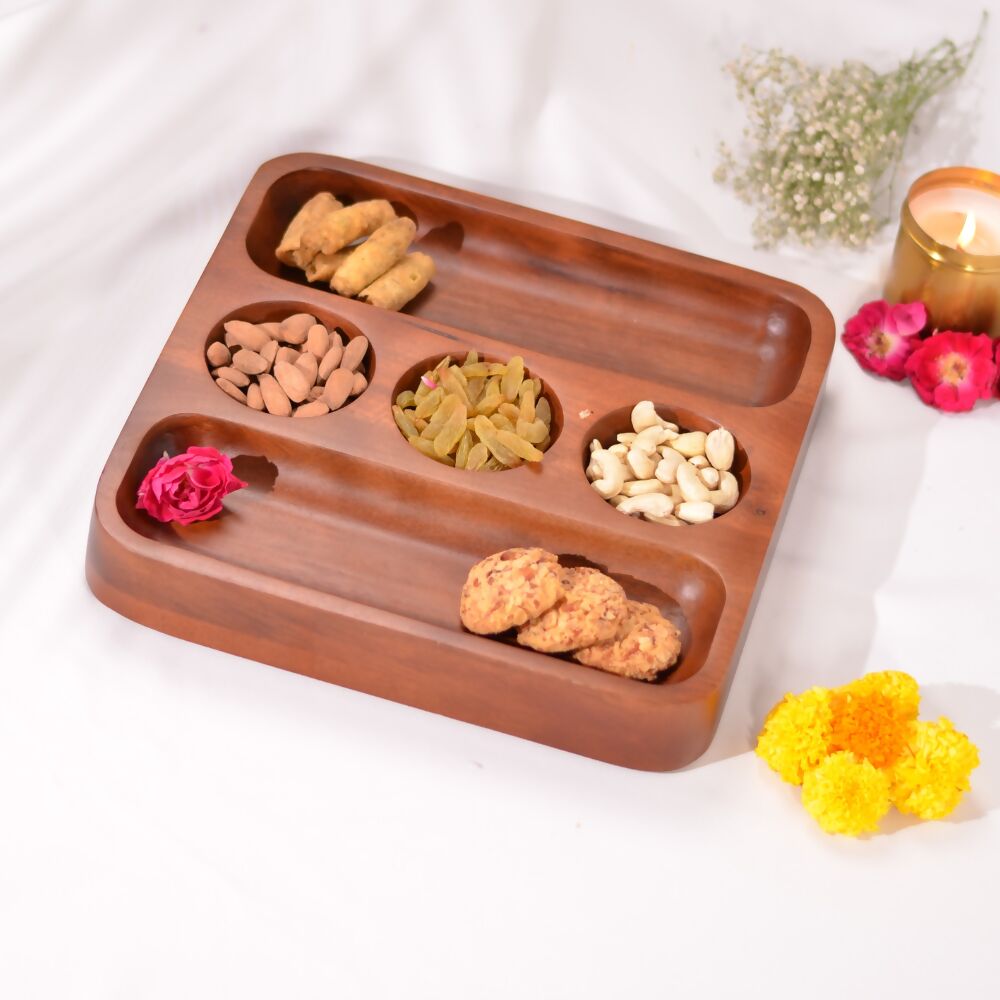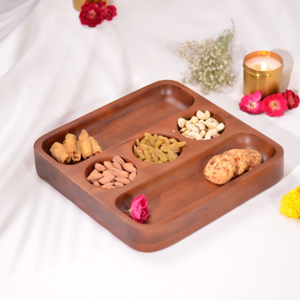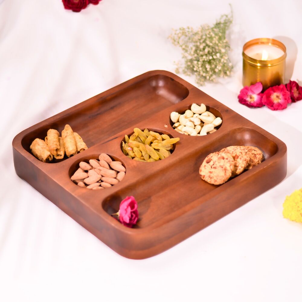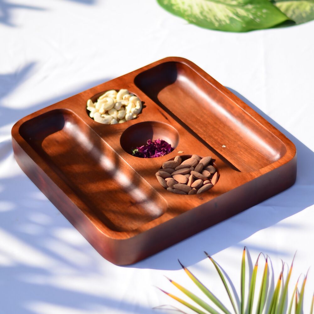 Our 3 bowl serveware or platter is perfect to serve savouries and desserts in style this festive season. This sleek and functional chip and dip platter is designed to seamlessly blend into any party set-up. The intricate design adds that touch of delightfulness. Suitable as a Kitchen organiser and Serving snacks&desserts. In the kitchen, this Multi-Purpose platter becomes an indispensable tool. It has 3 bowl and compartments, allowing you to neatly arrange your kitchen essentials. The sturdy construction ensures it can handle the weight without compromising its structural integrity.Can also be used to organise your masala boxes. It also acts as a stylish serveware. Its elegant design and premium finish make it an excellent choice for serving snacks, condiments, or even a small selection of desserts when entertaining guests. Your guests will be impressed by its multifunctionality and its ability to seamlessly transition from storage to serveware. Premium Design and finish at affordable pricing.