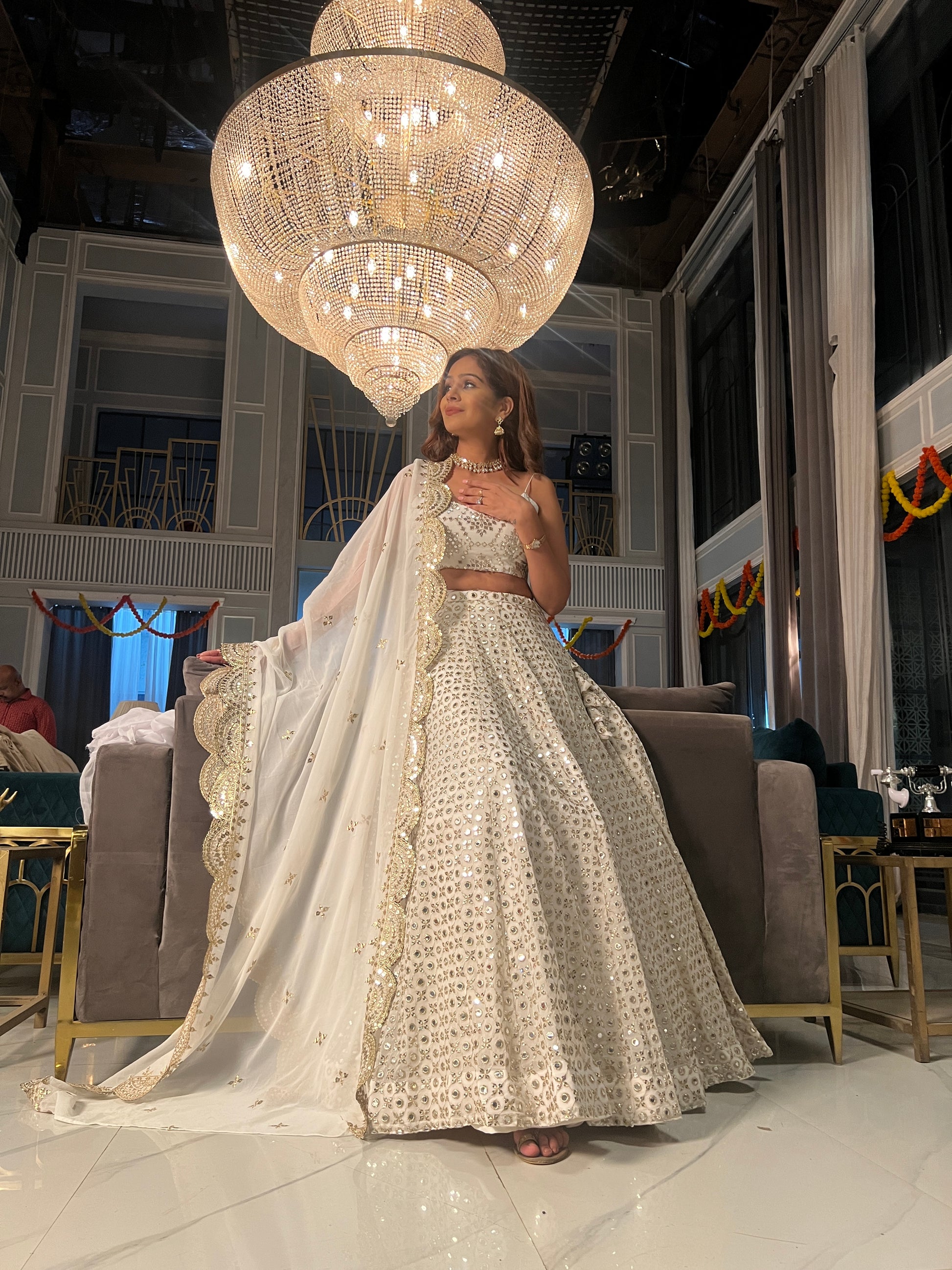 This stunning lehenga in pure georgette fabric, adorned with artificial mirror and sequin work, is the perfect blend of elegance and modern flair. The designer padded blouse enhances the chic look with its intricate sequin and zari detailing, while the scalloped dupatta adds a touch of sophistication. Ideal for festive occasions.