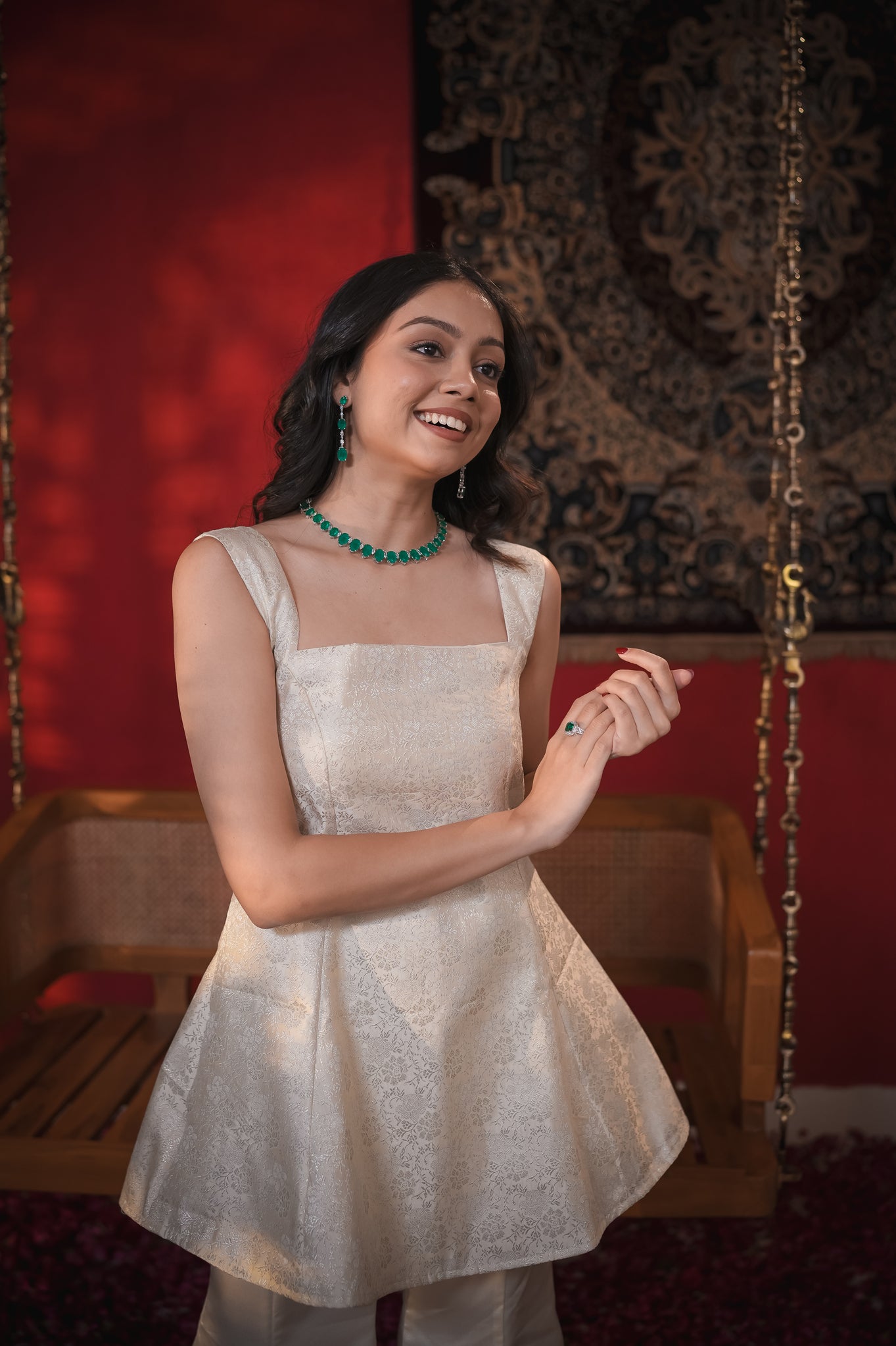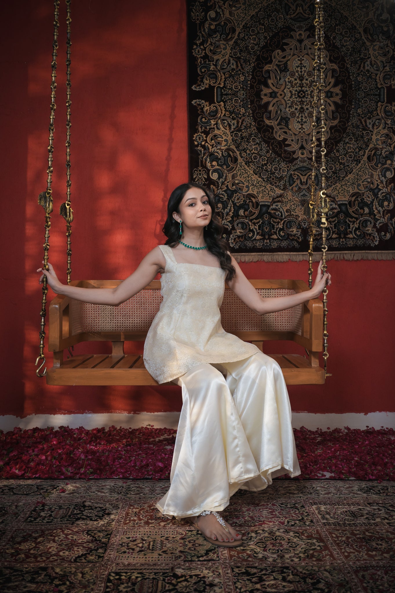 The Aisha Set is a refined ensemble that radiates subtle yet elegant vibes, perfect for chic glam occasions. It features a Banarasi princess cut short kurta with a rich texture that brings an elegant, traditional touch, paired with sleek satin bell-bottom pants that add a contemporary flair with their smooth finish and subtle shine.