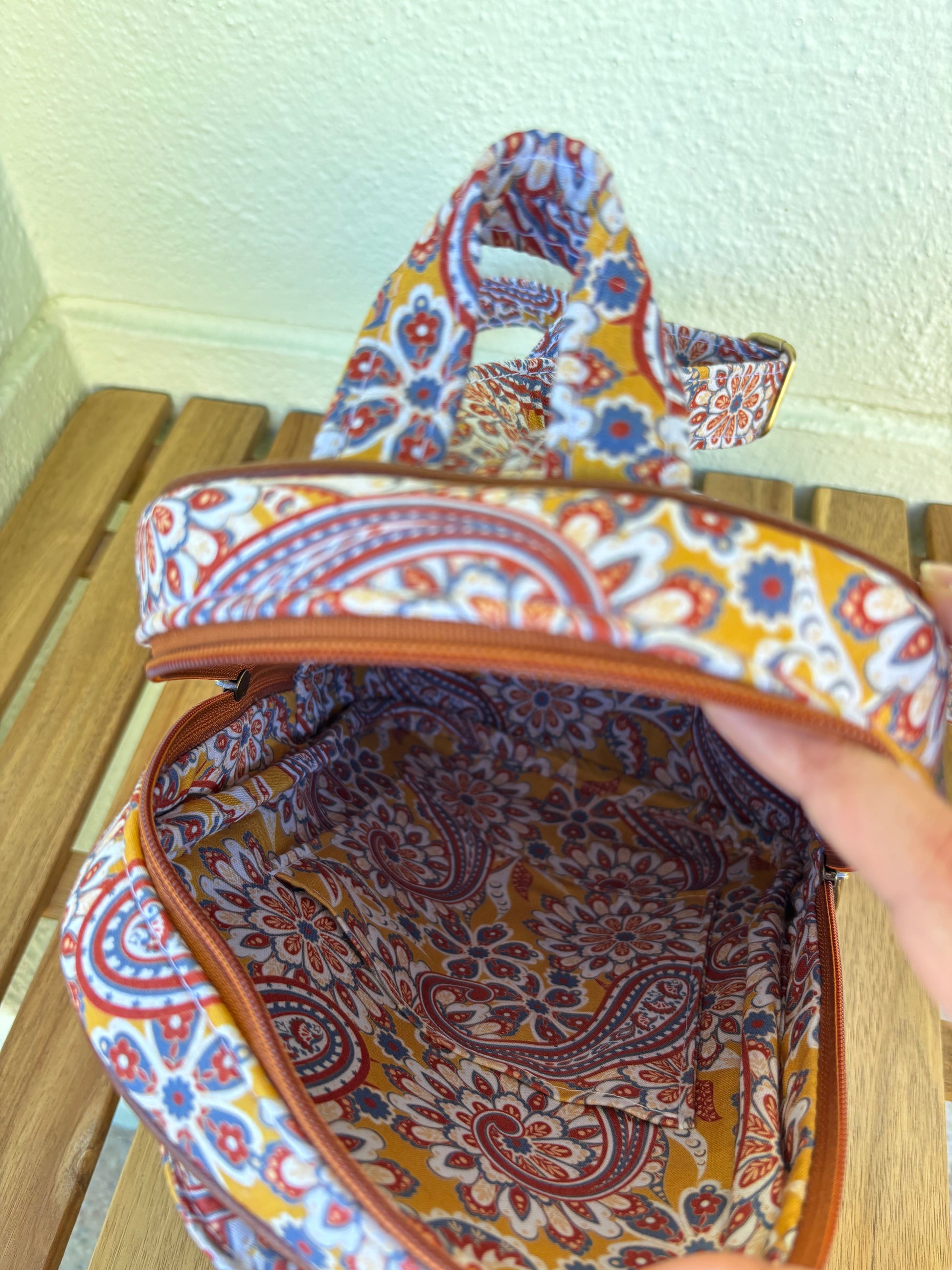 Warm and vintage-inspired, the Amber Paisley Backpack showcases intricate paisley and floral motifs in earthy mustard, rust, and white tones. Accented with rich tan faux leather and designed with adjustable straps, it blends timeless charm with everyday function. With spacious compartments and thoughtful inner pockets, it’s a beautiful balance of style and utility.