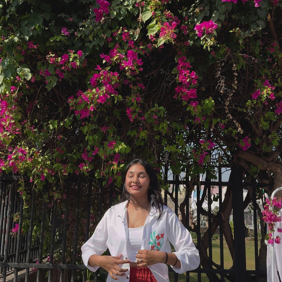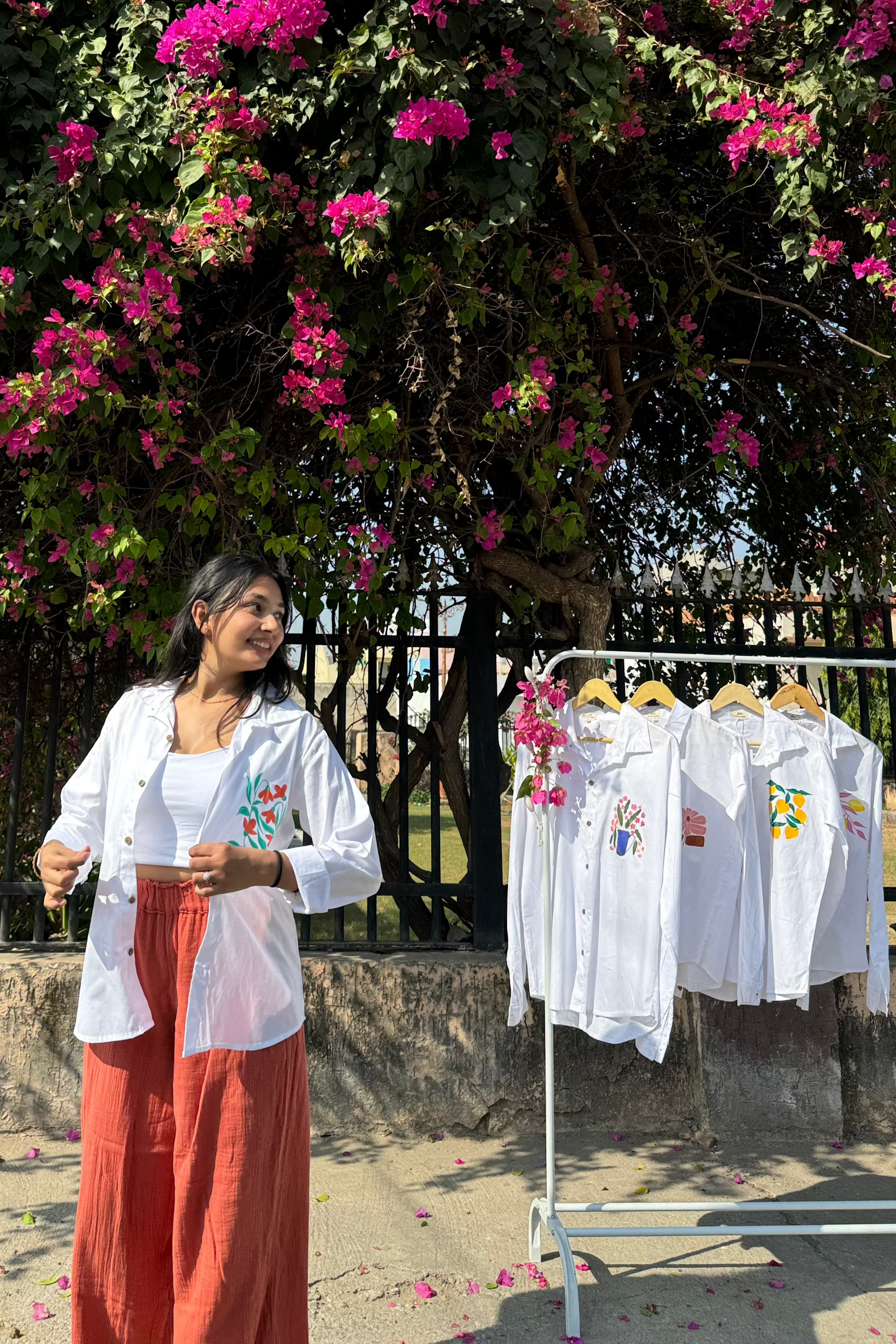 The Artistic Pocket Shirt is plain white button-down gets a playful twist with a colorful hand-painted pocket, making it a stylish and artistic addition to any wardrobe.