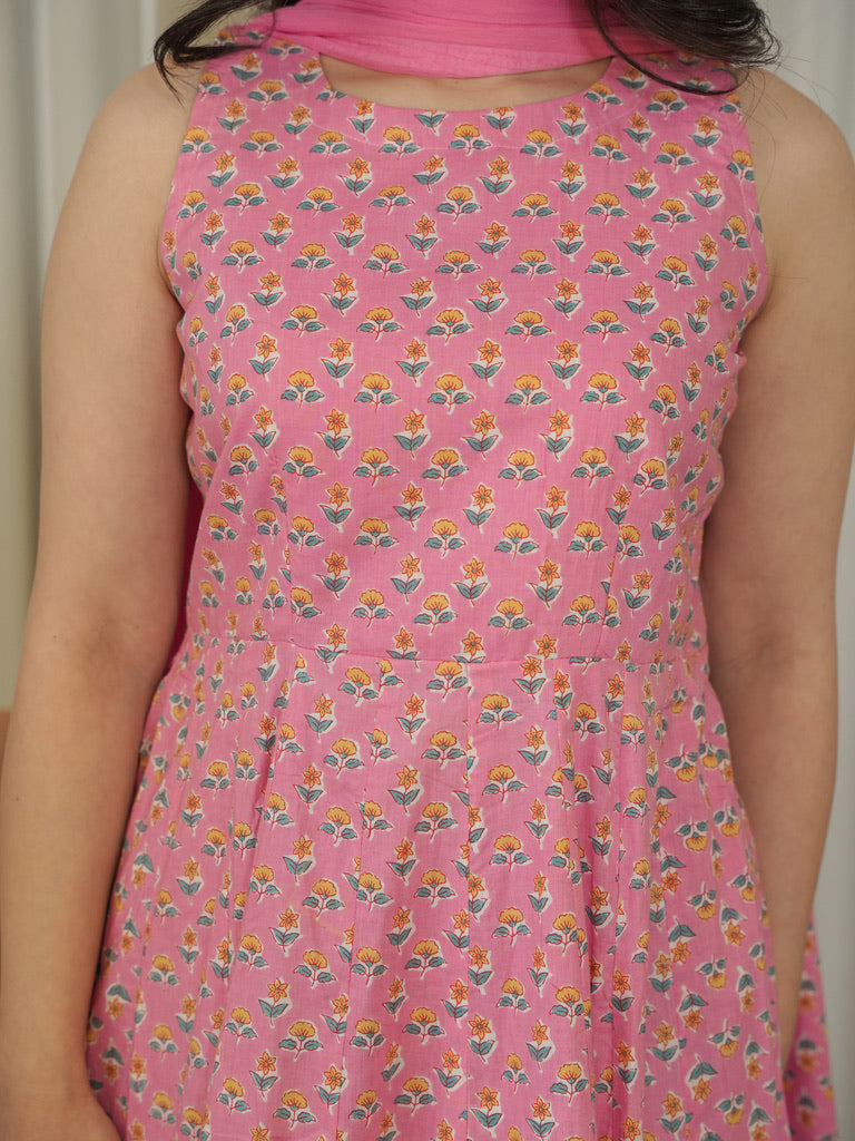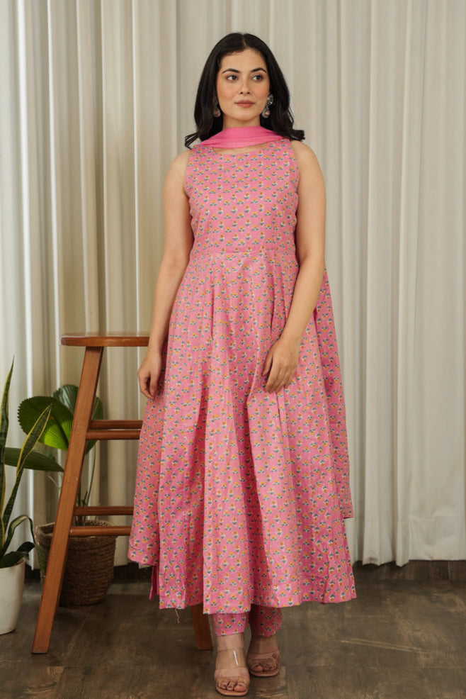 Azaa Block Print Cotton Anarkali Set with Print Paneled Dupatta
