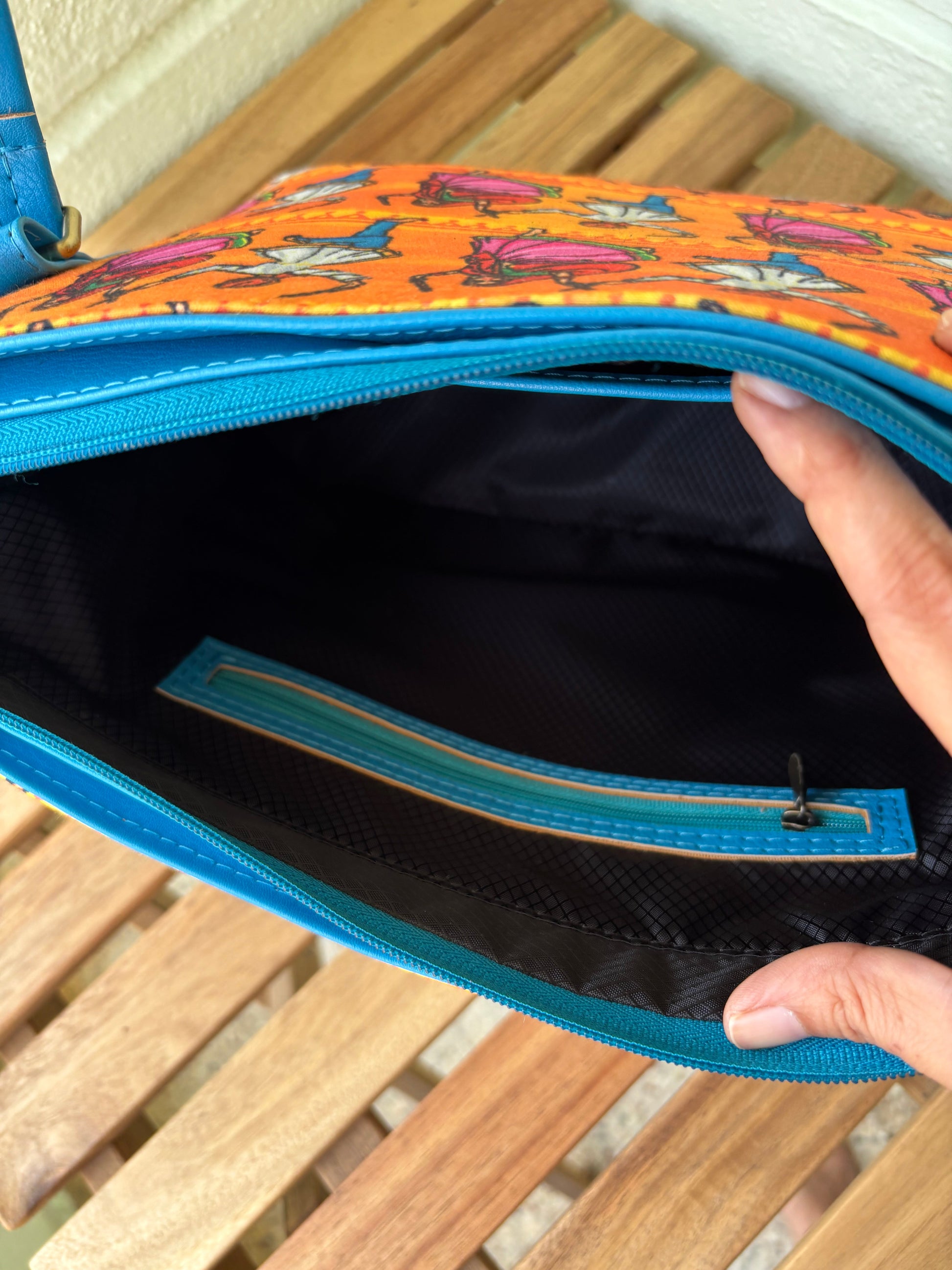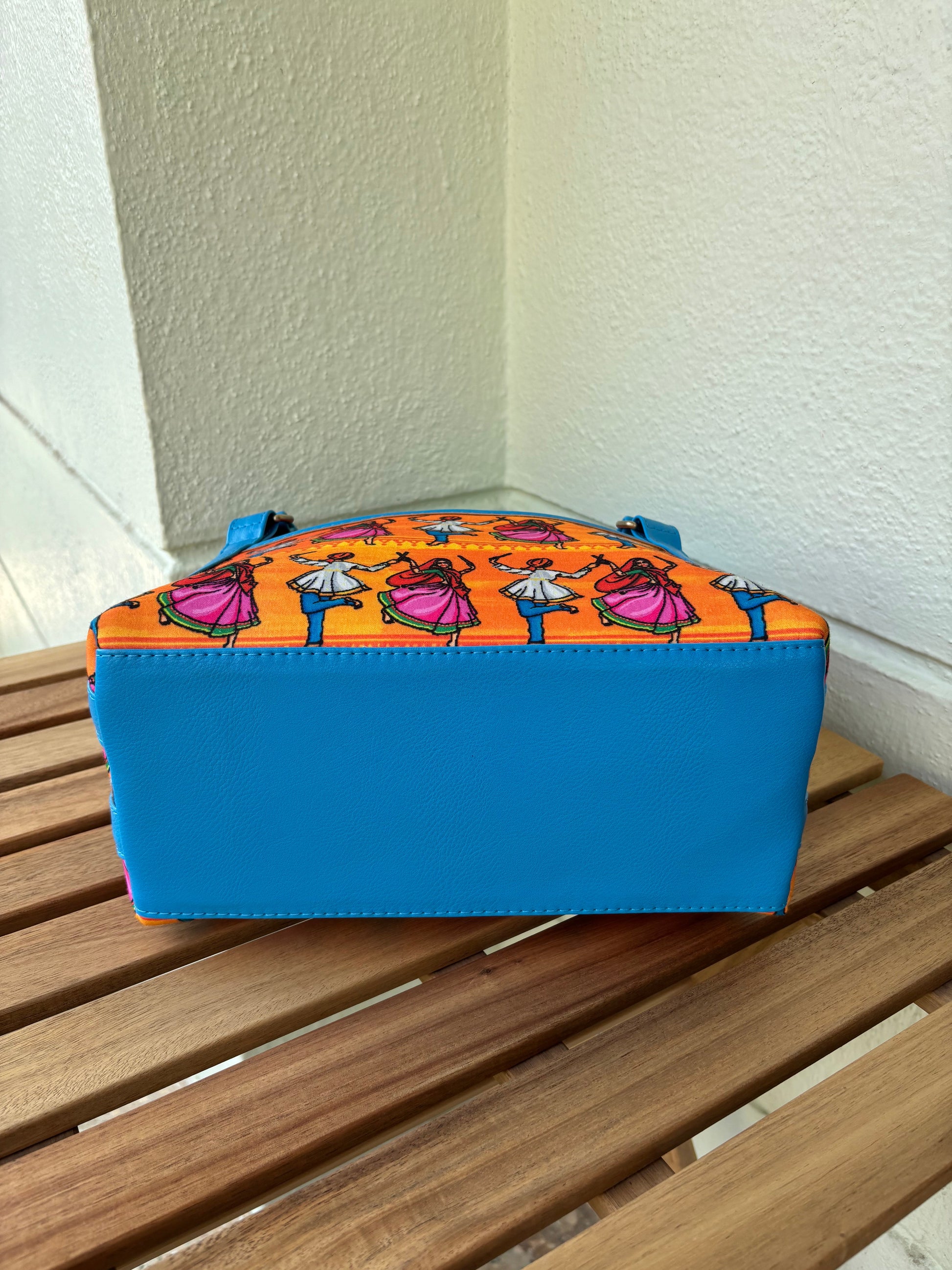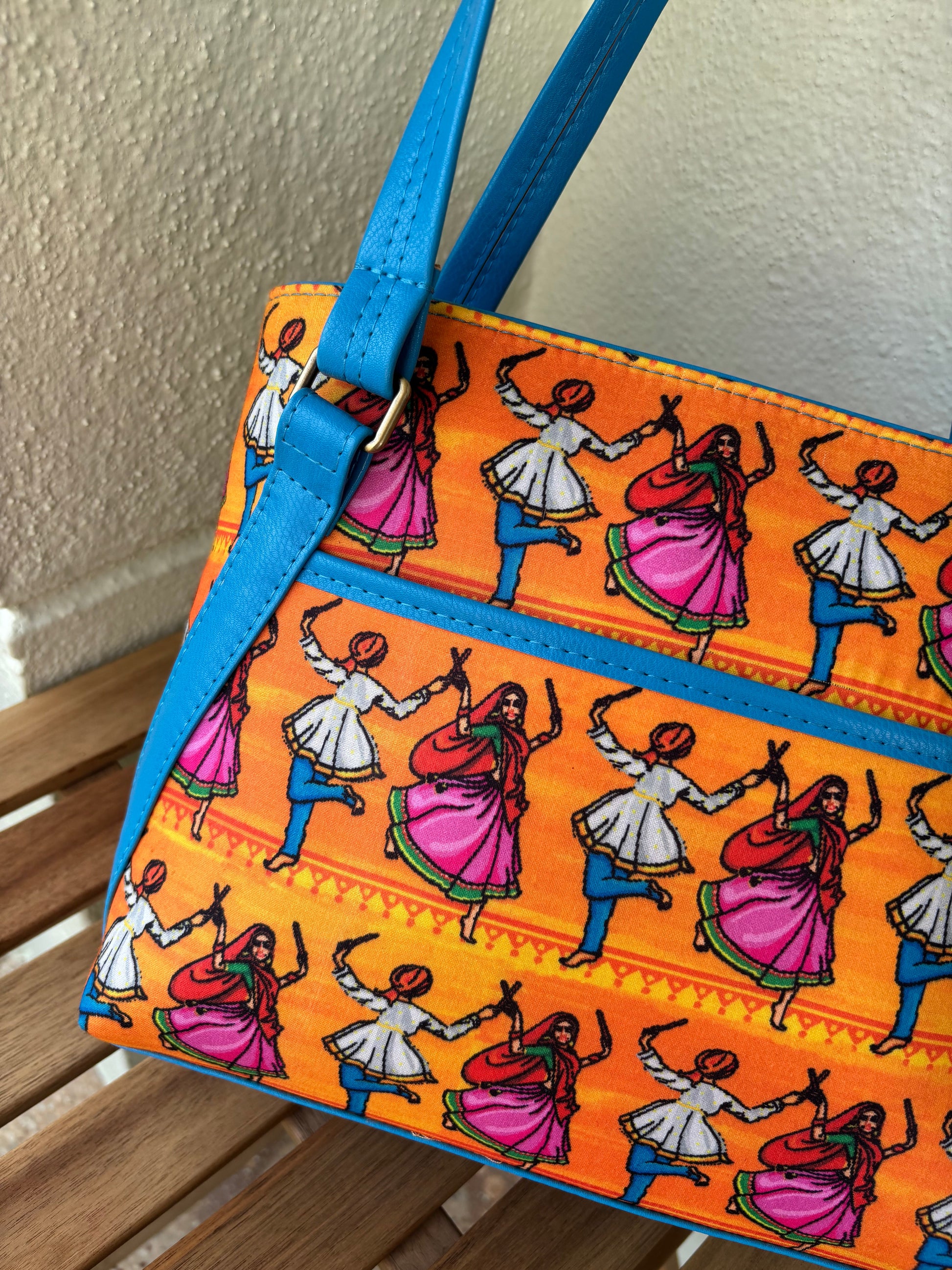 Full of rhythm and color, the Bhangra Bliss Tote celebrates Punjabi folk dance with a vibrant print on premium cotton fabric. Accented with striking blue faux leather, it blends cultural charm with everyday function. With a roomy zippered compartment, water-resistant lining, and organized pockets, it’s perfect for those who carry joy wherever they go.
