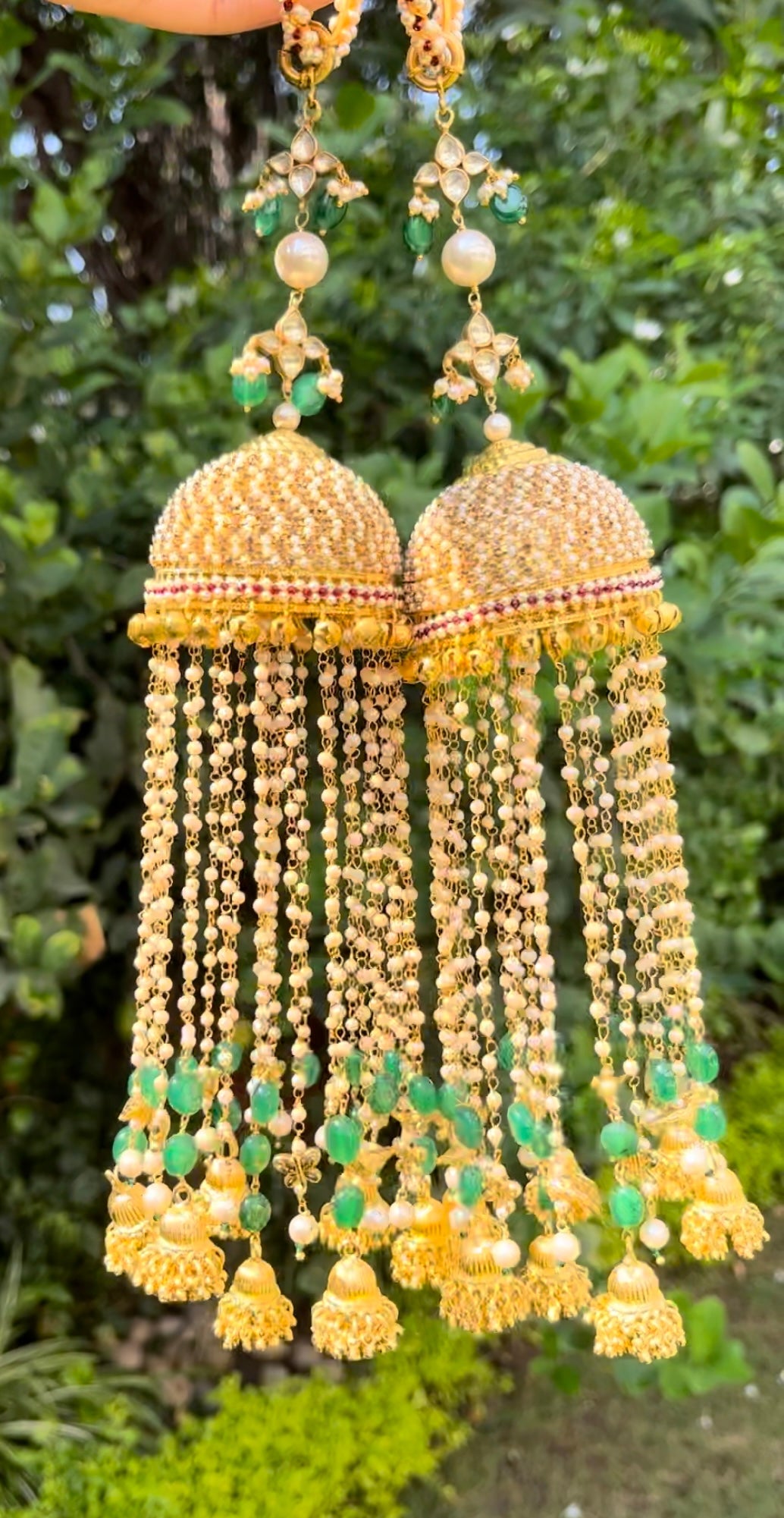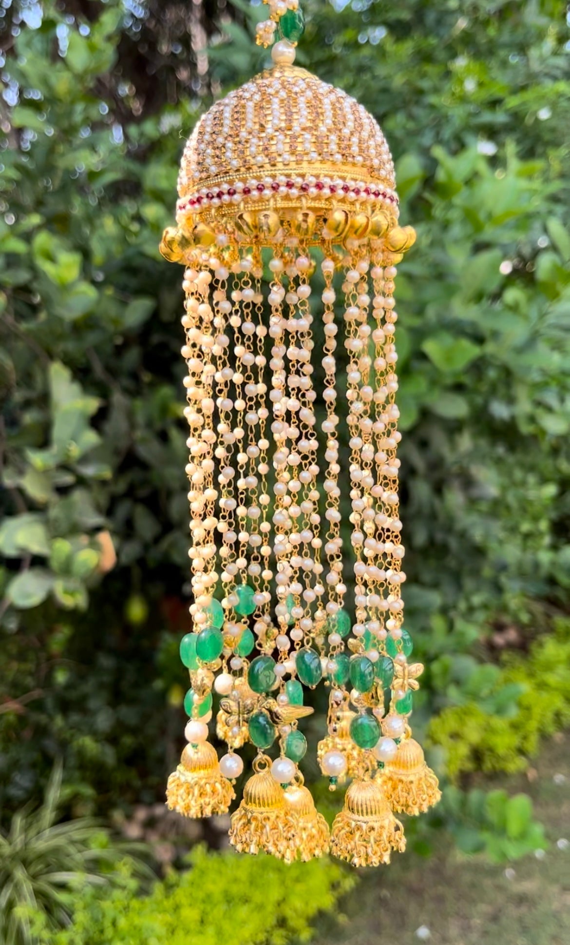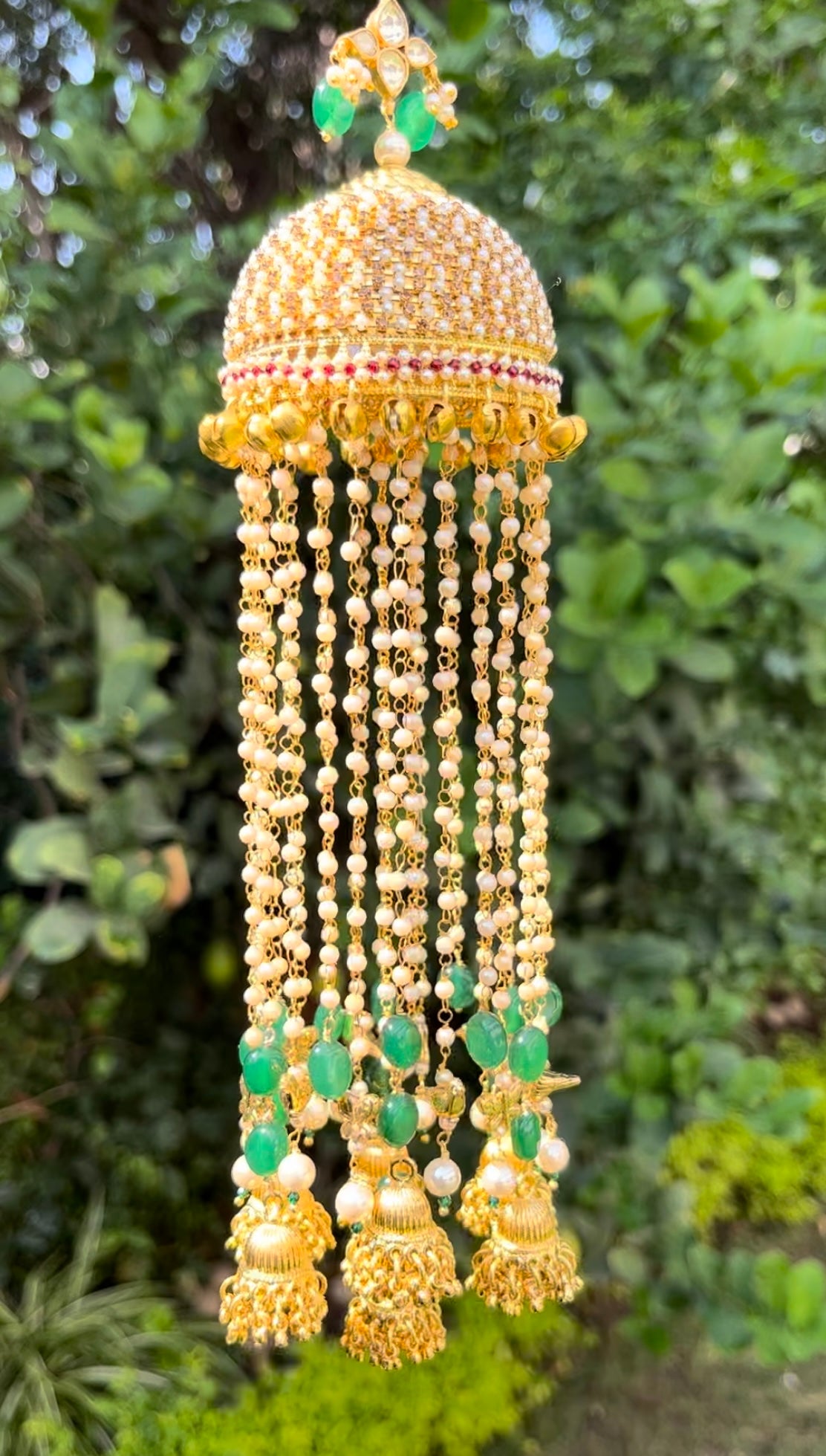 A stunning ode to bridal tradition, these Bride Bird Kaleeras feature intricately crafted domes adorned with layers of pearl and bead strings. Embellished with green stone drops and delicate golden bird motifs, each strand ends in ornate ghungroo-style tassels that shimmer and sway with grace. Designed to add royal elegance to your bridal ensemble, these kaleeras are a timeless symbol of celebration and new beginnings.
