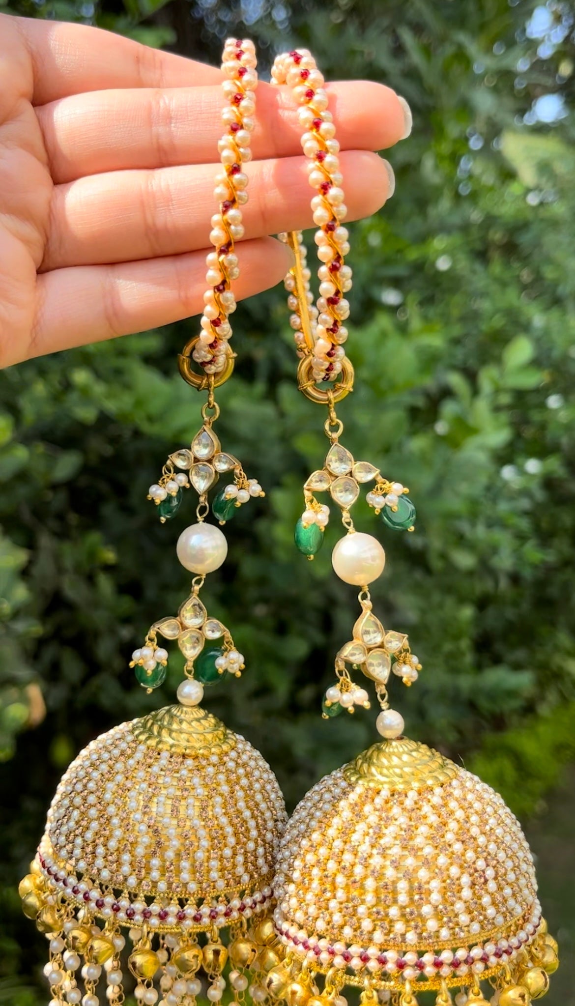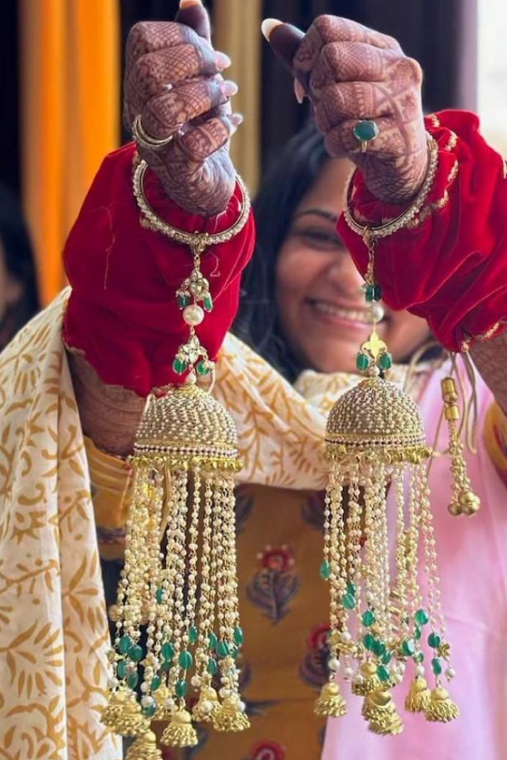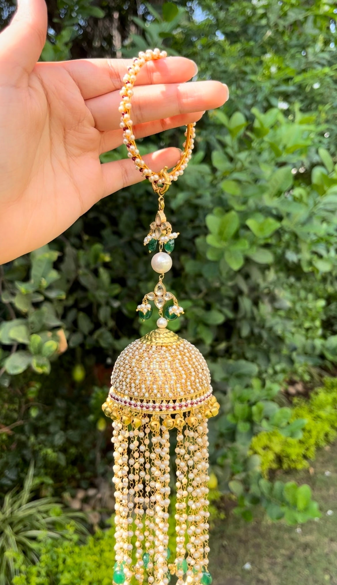 A stunning ode to bridal tradition, these Bride Bird Kaleeras feature intricately crafted domes adorned with layers of pearl and bead strings. Embellished with green stone drops and delicate golden bird motifs, each strand ends in ornate ghungroo-style tassels that shimmer and sway with grace. Designed to add royal elegance to your bridal ensemble, these kaleeras are a timeless symbol of celebration and new beginnings.
