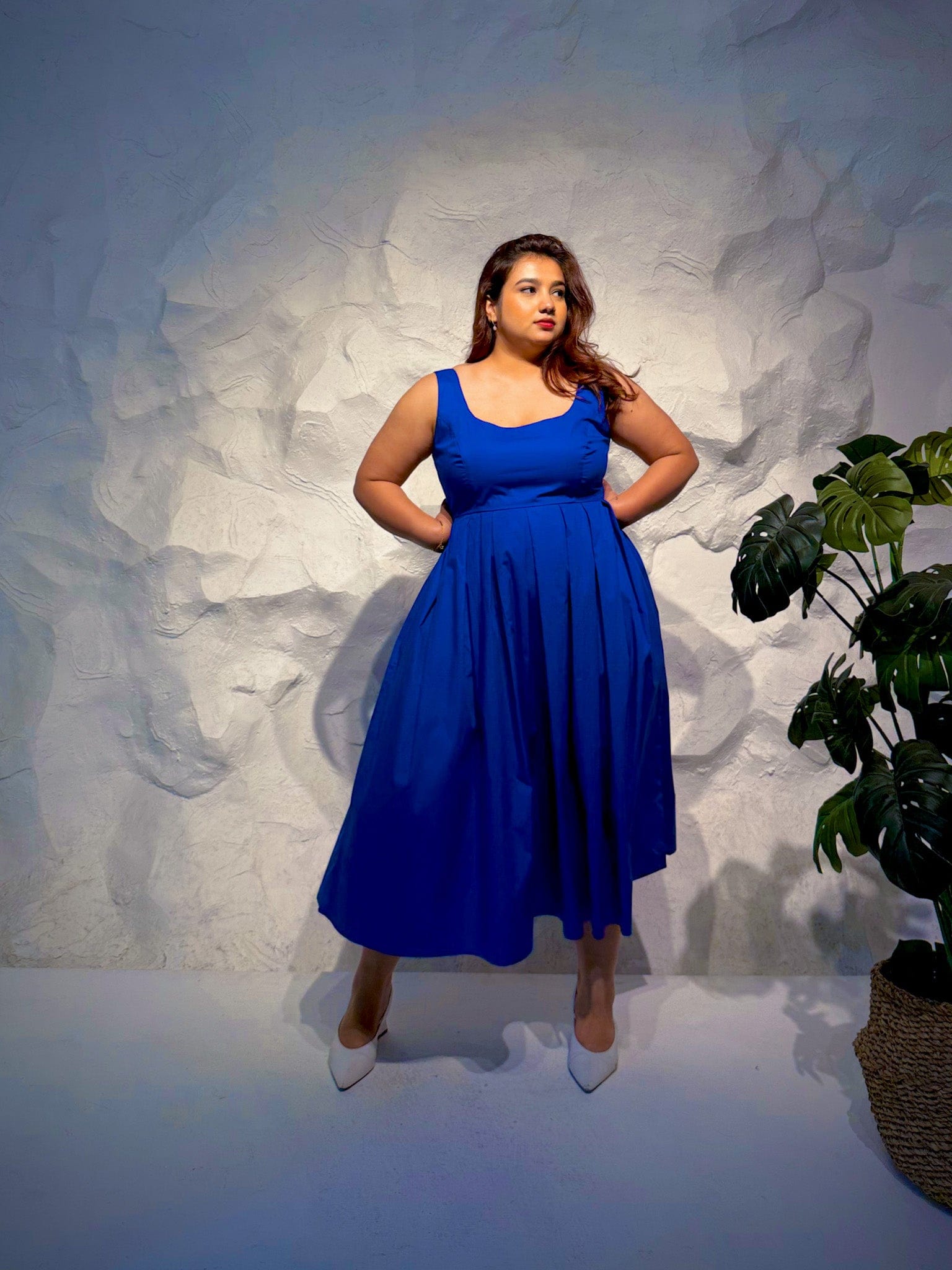A romantic midi dress crafted in breathable cotton, featuring a flattering square neckline, wide shoulder straps, and a softly pleated skirt that adds graceful volume. Designed with a fitted bodice and practical side pockets, this dress blends structure with ease—perfect for daytime events, brunches, or an elevated everyday look.