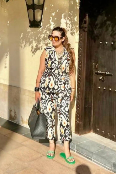 A Classic Black Ikat Print Sleeveless Double Breast Blazer with Pants Co-ord set, for a classic Look . There is a separate belt that you can choose to wrap around the Blazer to give it an edgy look. You can never go wrong with black.