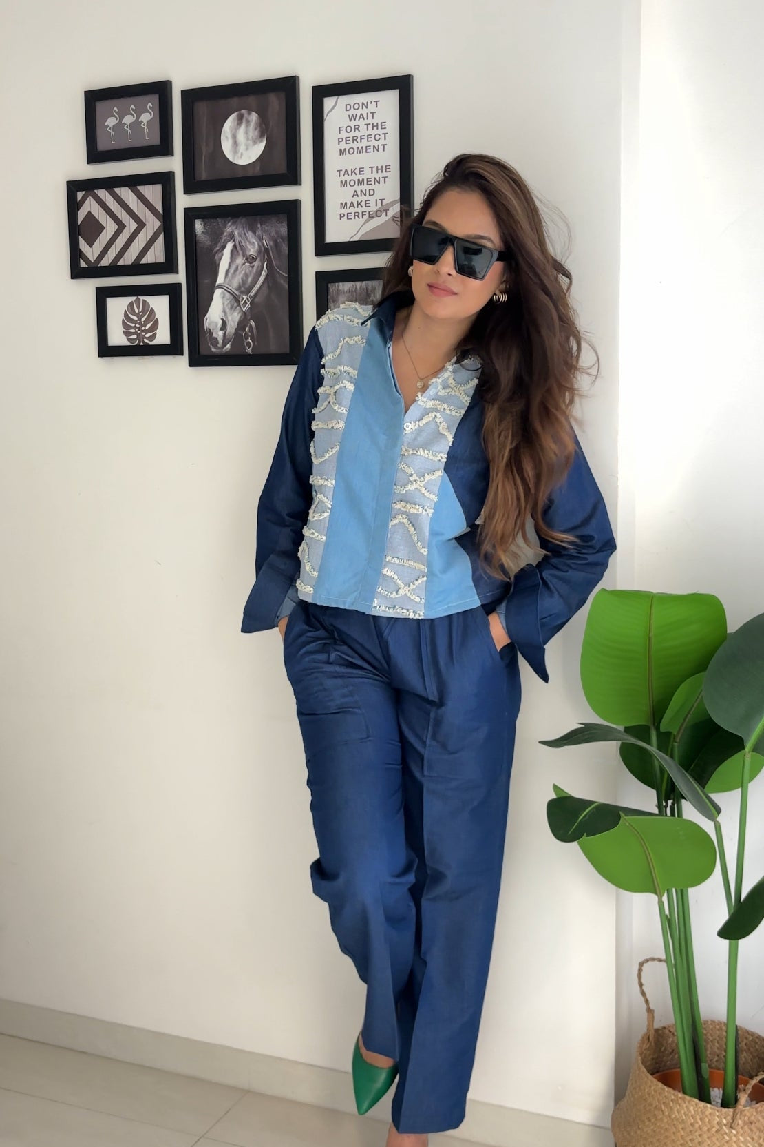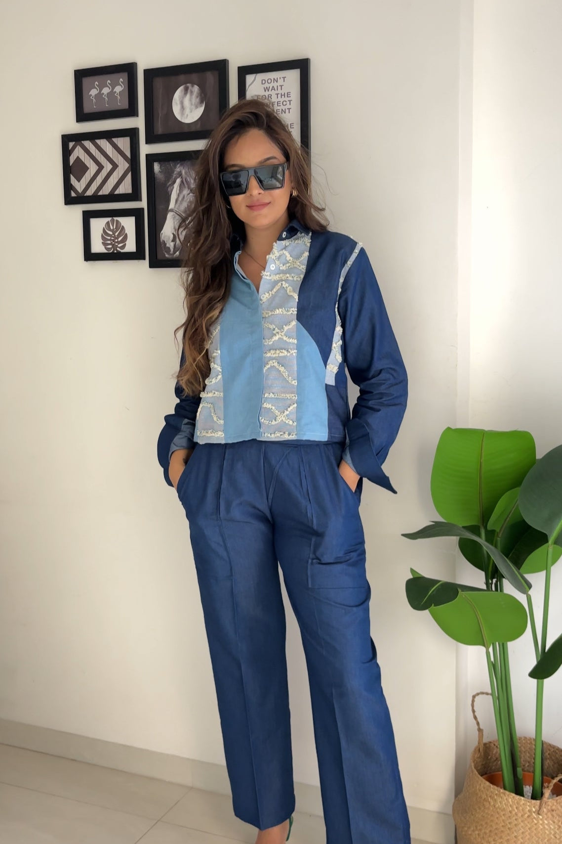 The Denim Stripe Crop Coord Set is a chic and contemporary take on classic denim, designed for effortless style and versatility. Featuring a cropped top with a tailored fit and matching high-waisted bottoms, this coord set is adorned with subtle striped detailing, adding a modern edge to the timeless denim look.