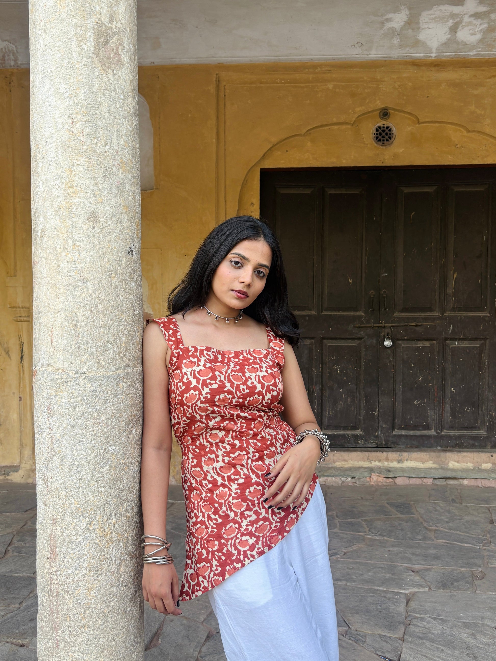 Ekaa speaks the language of simplicity with its warm brown tones and subtle brick patch detailing. The square neckline and half sleeves add clean structure to the minimal silhouette.