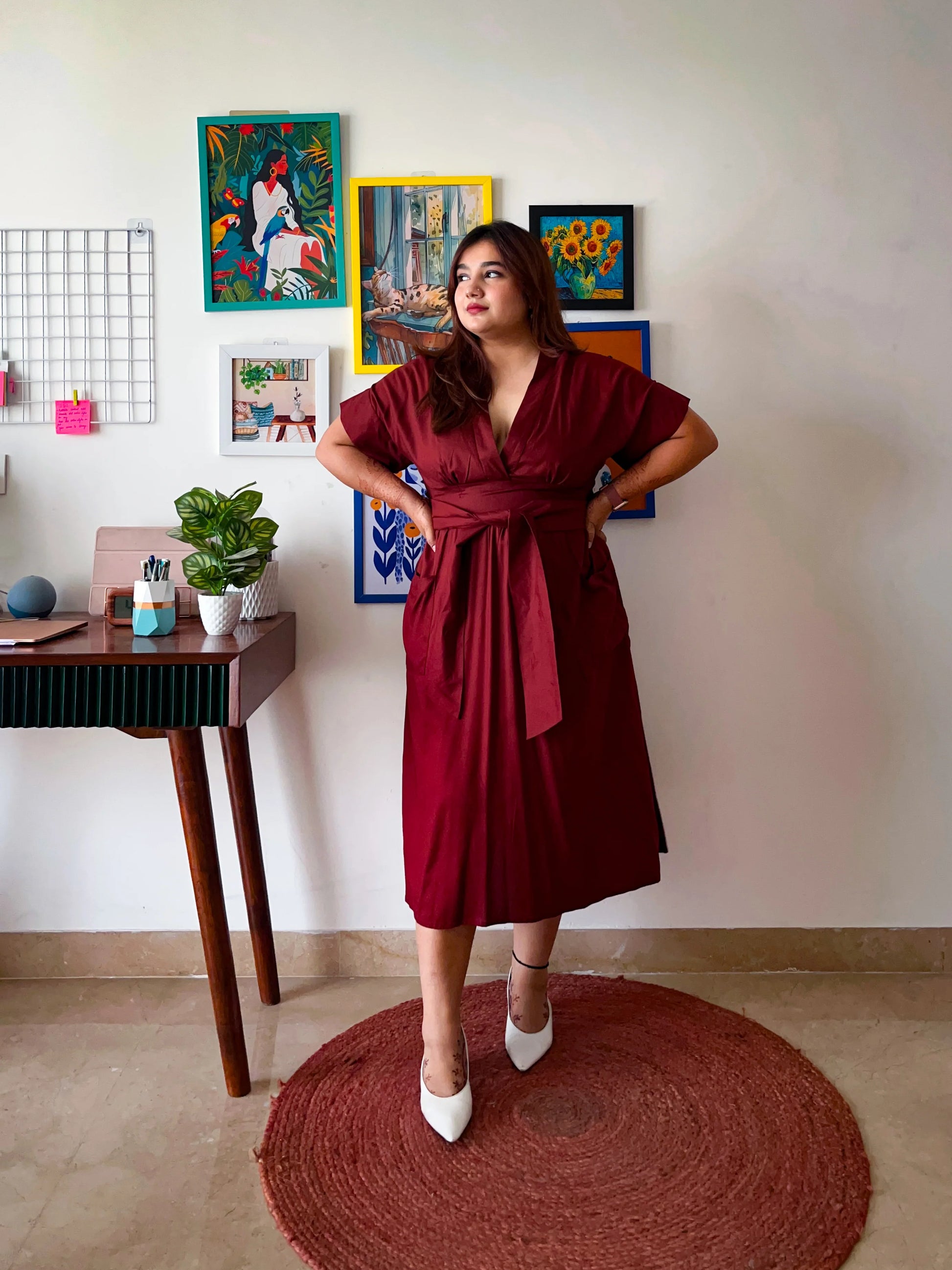 The Erin Maroon Midi Dress combines effortless style with functional elegance. Crafted in a rich maroon hue, this dress features flattering patch pockets and a self-tie belt that cinches the waist for a hugged fit. With its clean lines and contemporary design, it's perfect for both casual outings and chic evening events. A versatile wardrobe staple that radiates sophistication and comfort.
