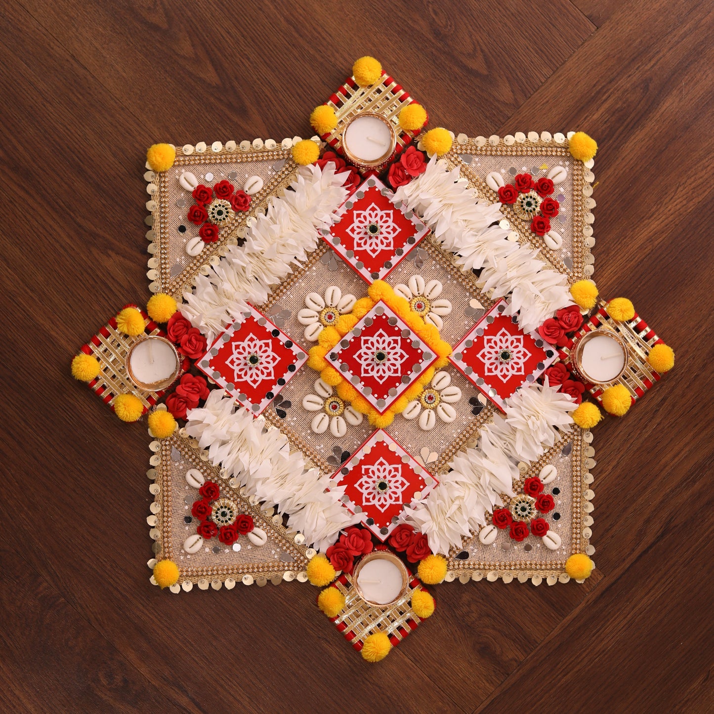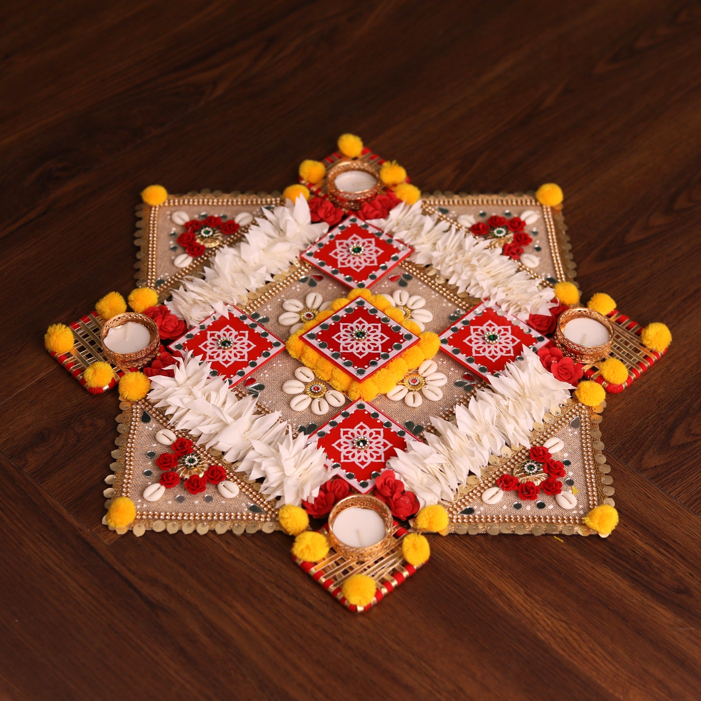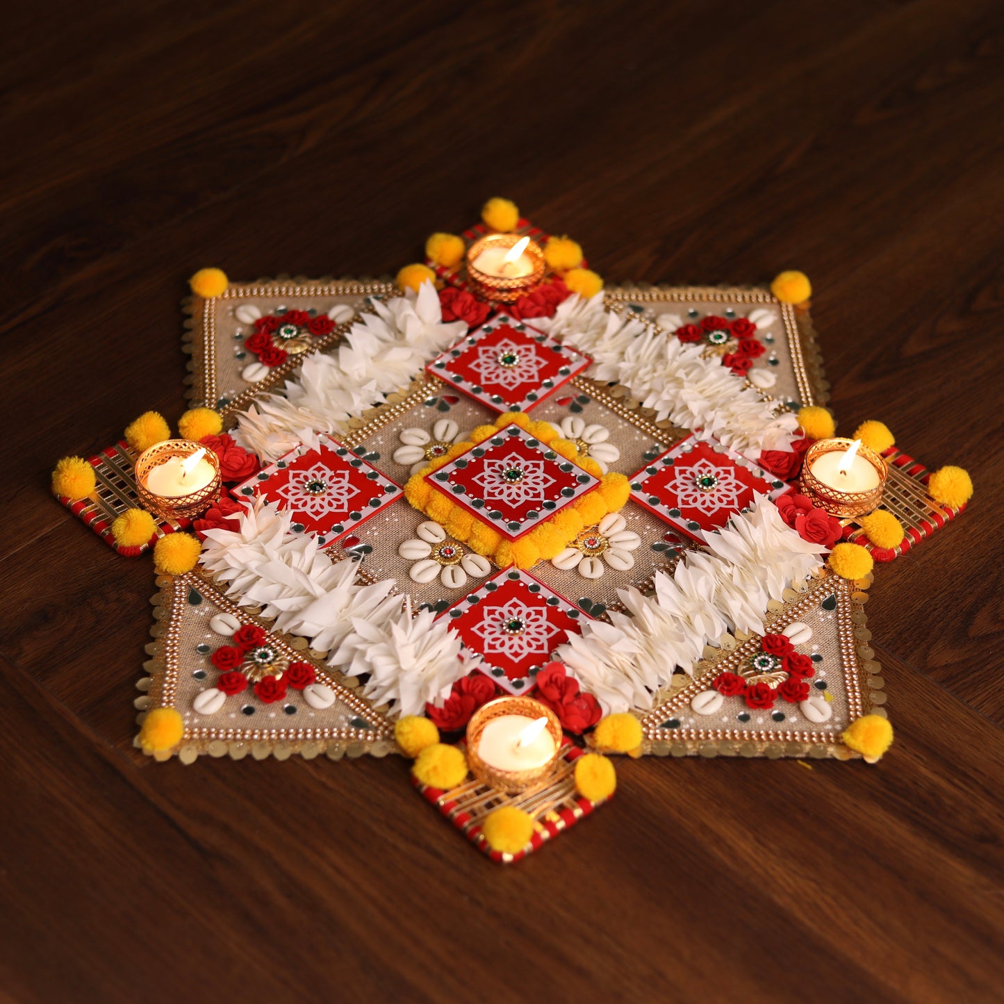 pearls, beads, Kundan, shimmering lace patterns, and much more. You can include these rangolis in your Diwali gift hampers and presents. Pick your favourite from our durable and handy rangolis.