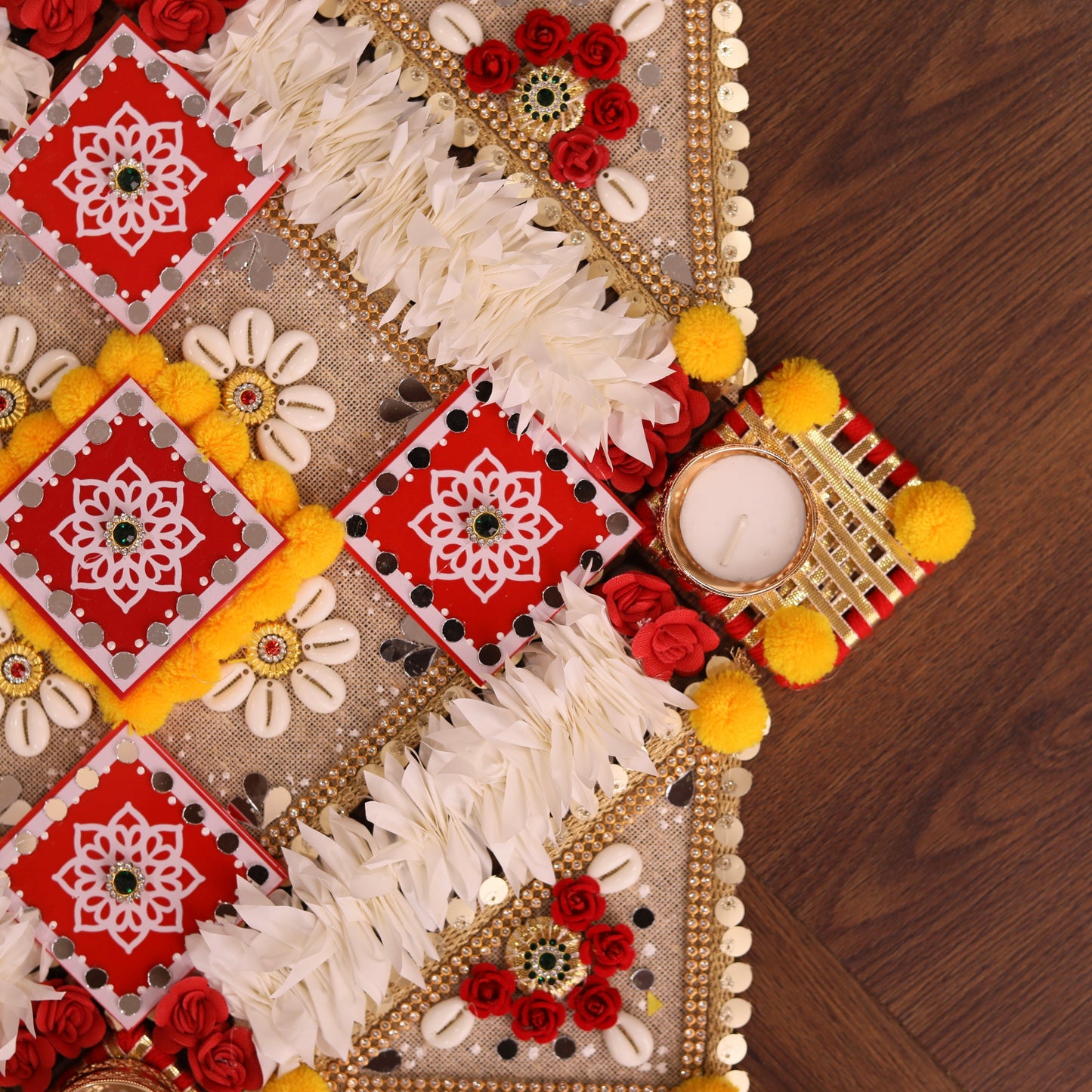 Welcome the Goddess of wealth and fortune Laxmi to your homes with our beautifully designed readymade rangolis'. Each rangoli design is unique and intricately created together by our artisans for you.Available in different prints and vibrant colors, these Rangolis' will add zest to your festivals and home decor.