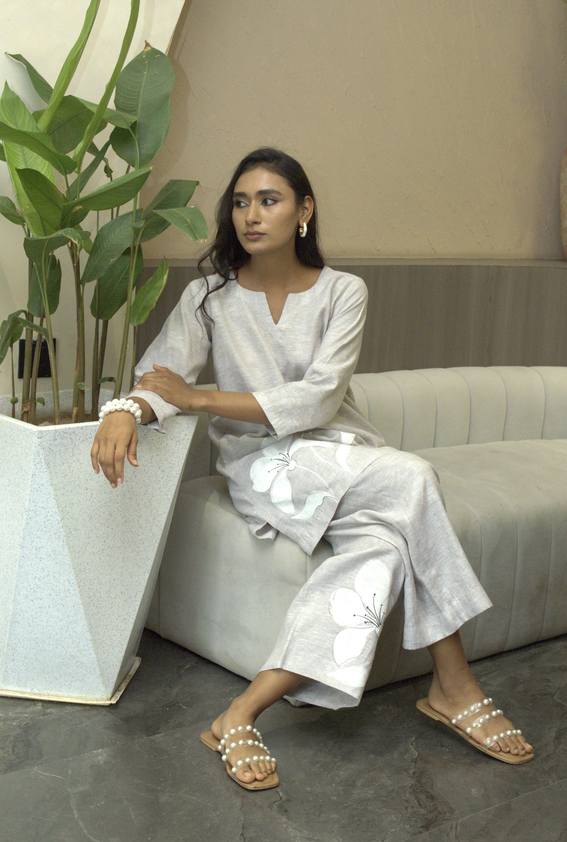 The Hazel Kurta Set in is a refined ensemble that epitomizes understated elegance. Crafted from pure linen, the mint greengreyasing meticulous artistry. Paired with matching linen pants featuring functional pockets, this set offers both style and practicality. Ideal for daytime events or casual gatherings, the Hazel Kurta Set combines traditional craftsmanship with contemporary design.