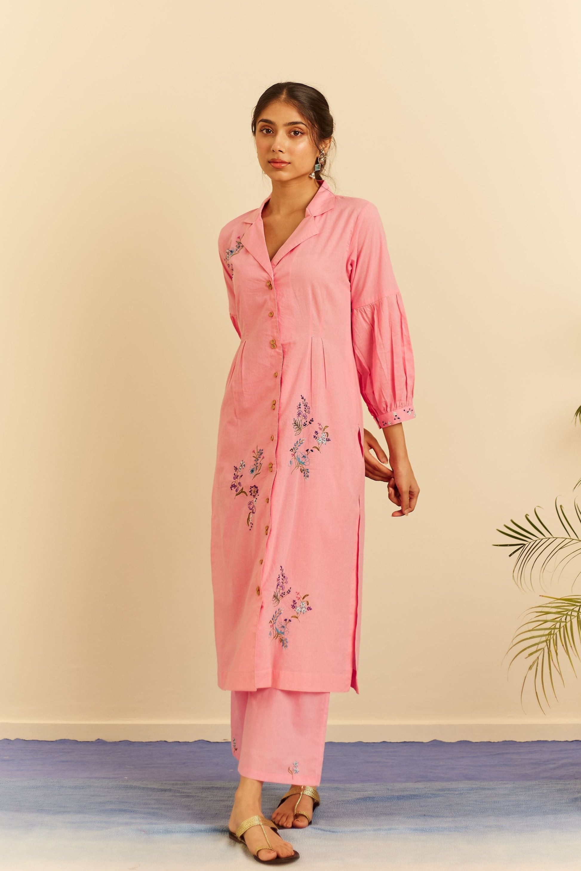 Elevate everyday elegance with our pink cotton kurta set. Featuring a chic lapel, button placket, and waist darts, this straight-fit ensemble boasts half puff sleeves and intricate placement embroidery. Paired with embroidered straight pants, it's the epitome of smart sophistication for events and offices alike.