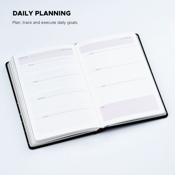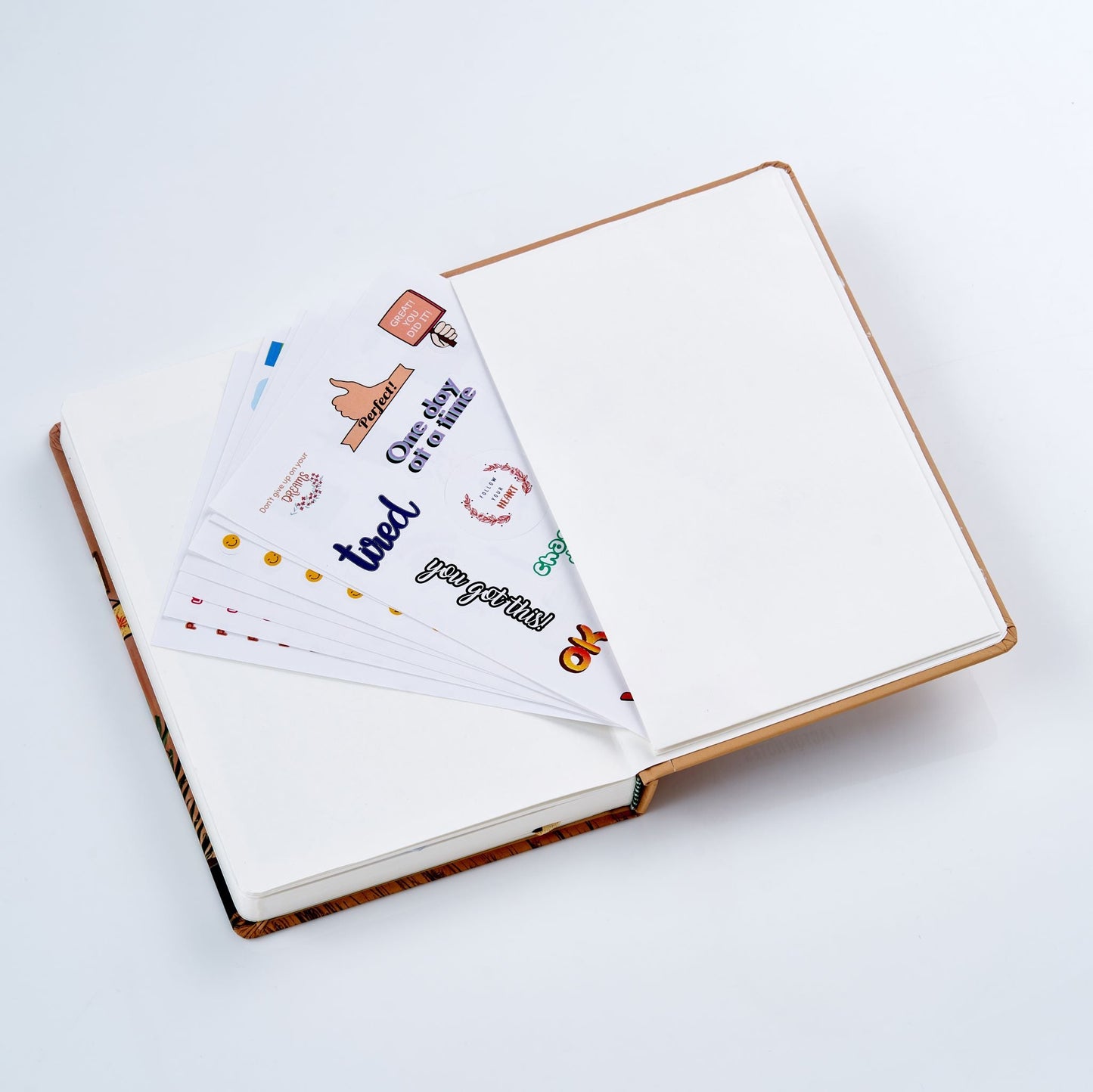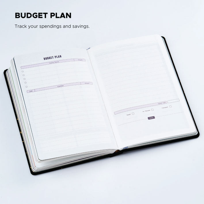 Sneak peek: 8 Sheets Stickers | Habit Trackers | Monthly stress-buster activities | Improvement Plan| Letter to Future Self| Vision Board | Sleep Trackers | Bucket & Anti-Bucket List | Budget Tracker | Monthly Dividers to motivate you| Self-Exploration Prompts to get to know yourself better | Monthly Affirmations | Mood Trackers | Monthly Reflections | Weekly reflection | Monthly Meal Planning | Shopping List | Reminders | Reading & Learning List | Movies & Series Watchlist | Wishlist | Possessions List | Annual Vacation Plan | 3 Bookmark ribbons | Inner pocket for storage