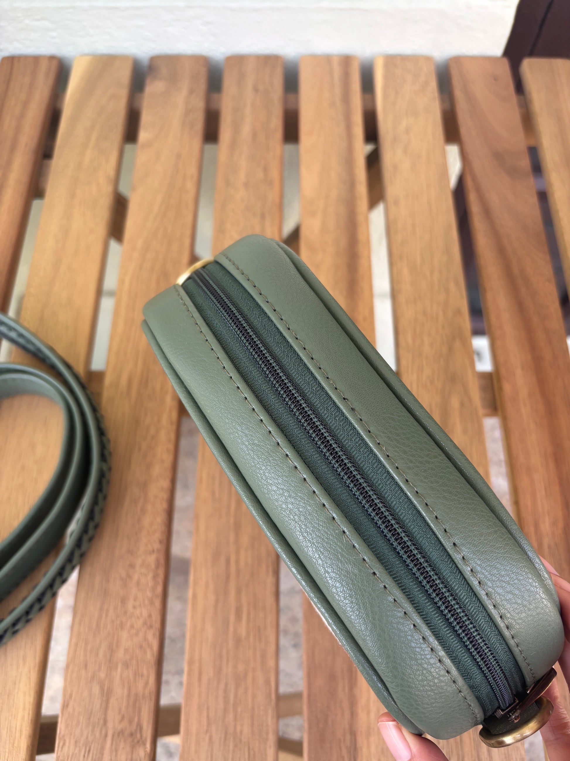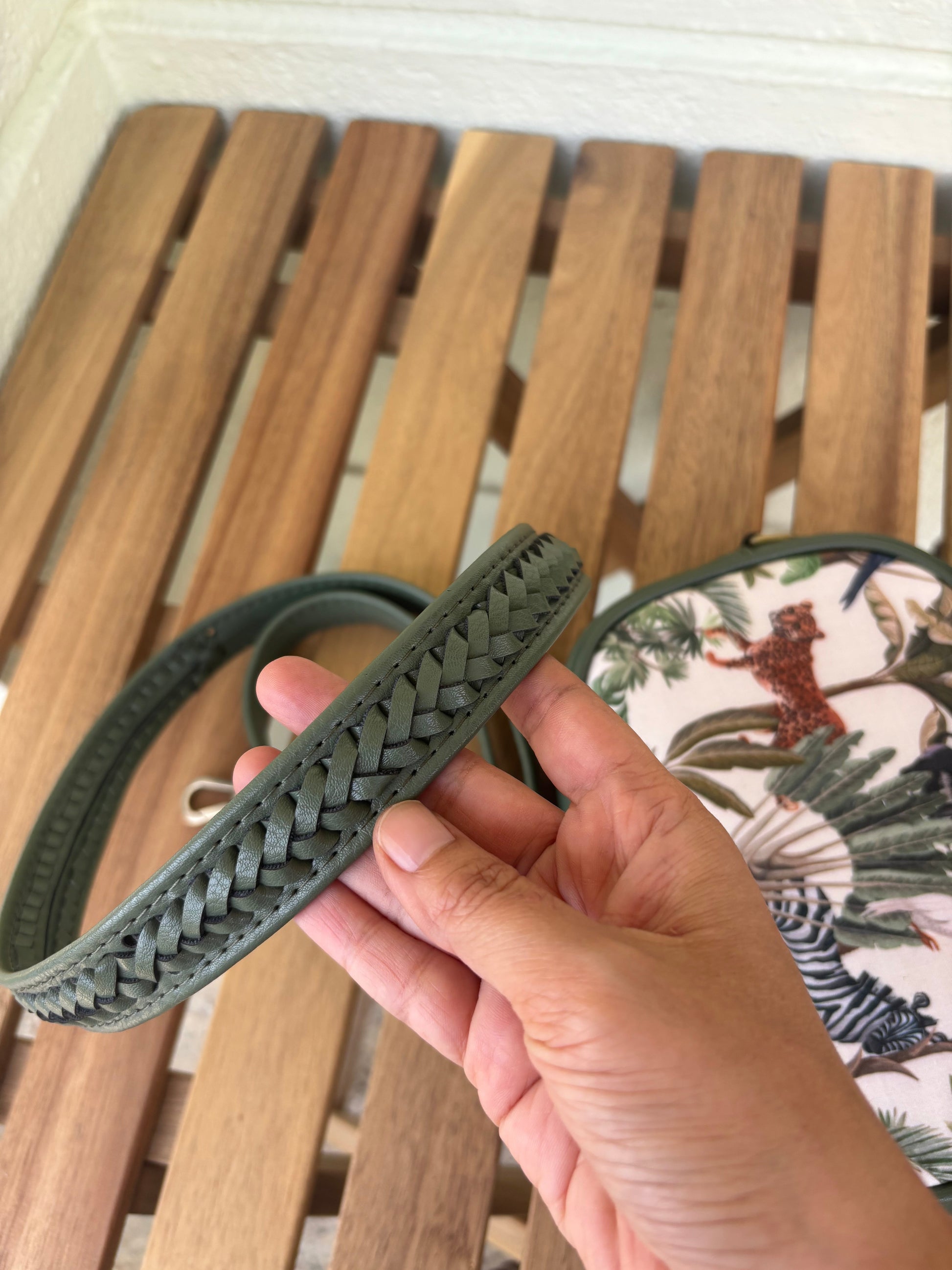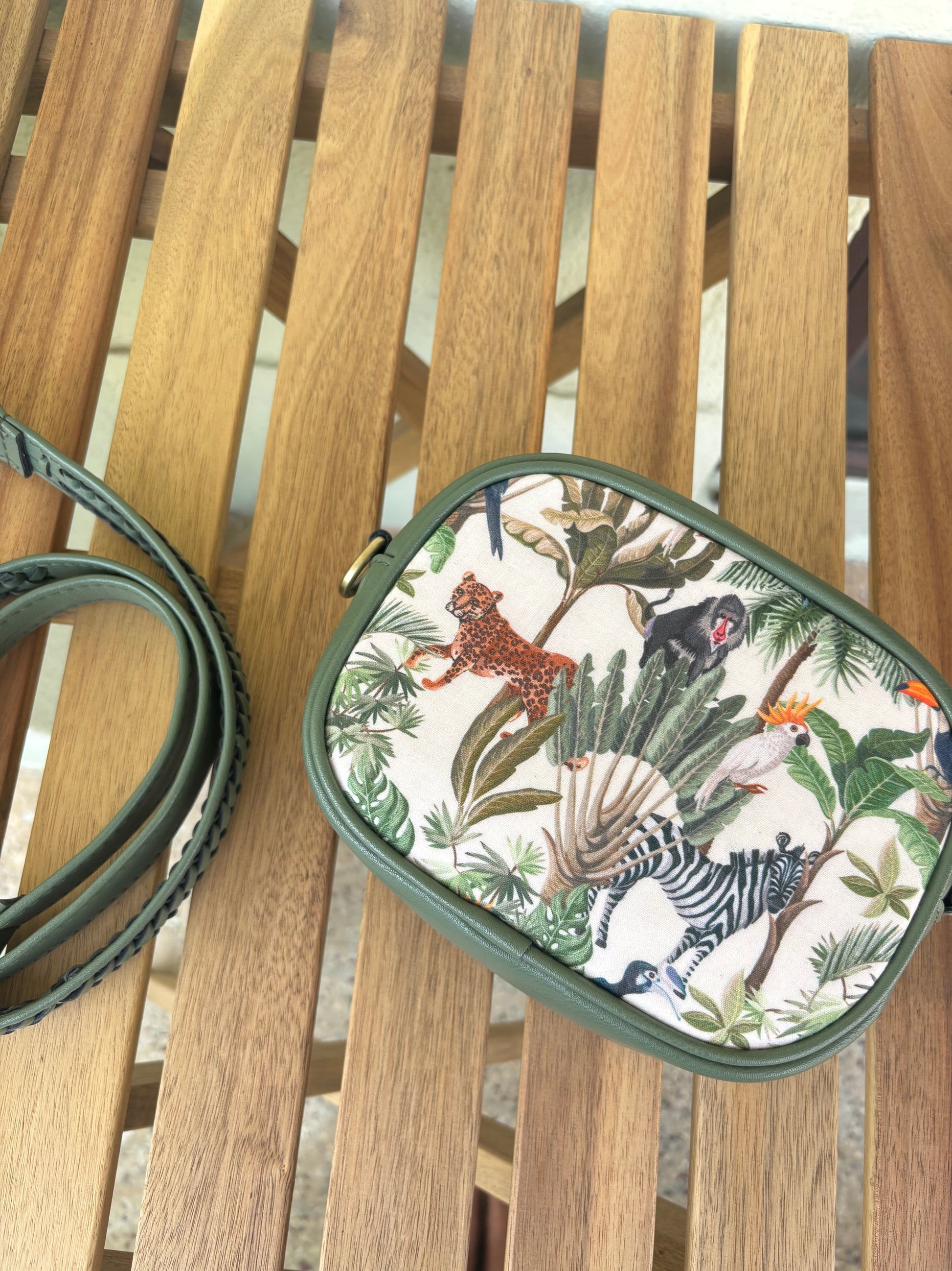 A refined blend of nature and craftsmanship. Featuring a bold jungle print on pure cotton, framed in earthy green faux leather, and finished with a hand-braided strap—each piece is truly one of a kind. Compact, functional, and artfully made for everyday elegance.