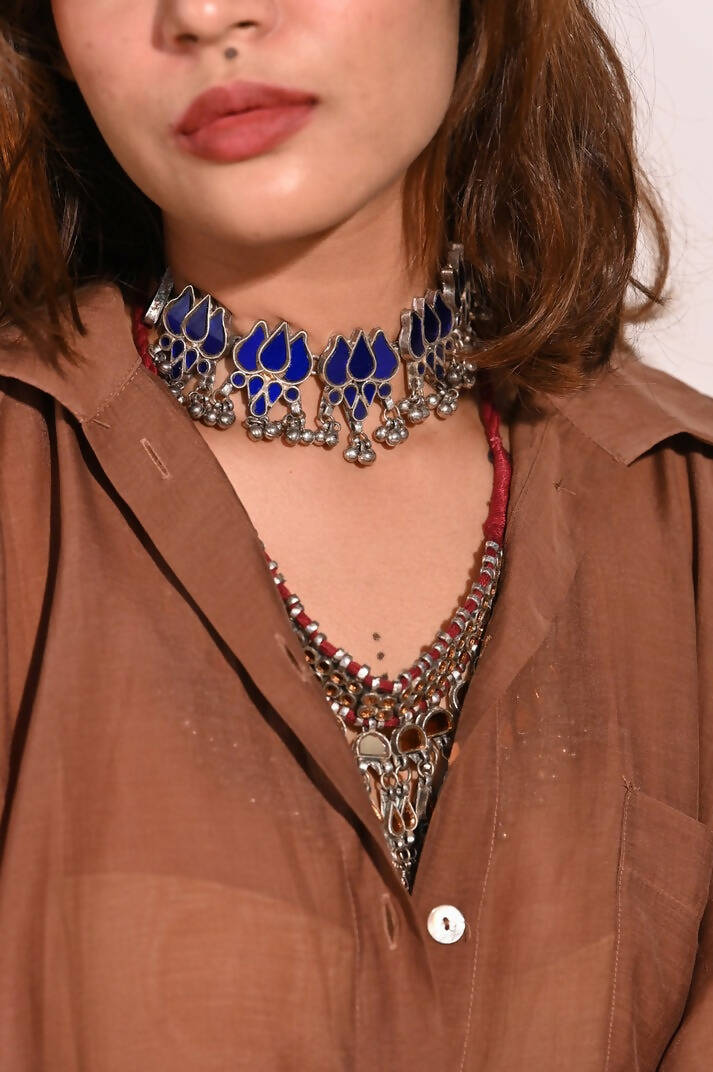 Handcrafted with love, this lotus motif neck piece is made from real glass and brass. Since its handmade there are few irregularities in the piece which ads to its beauty.