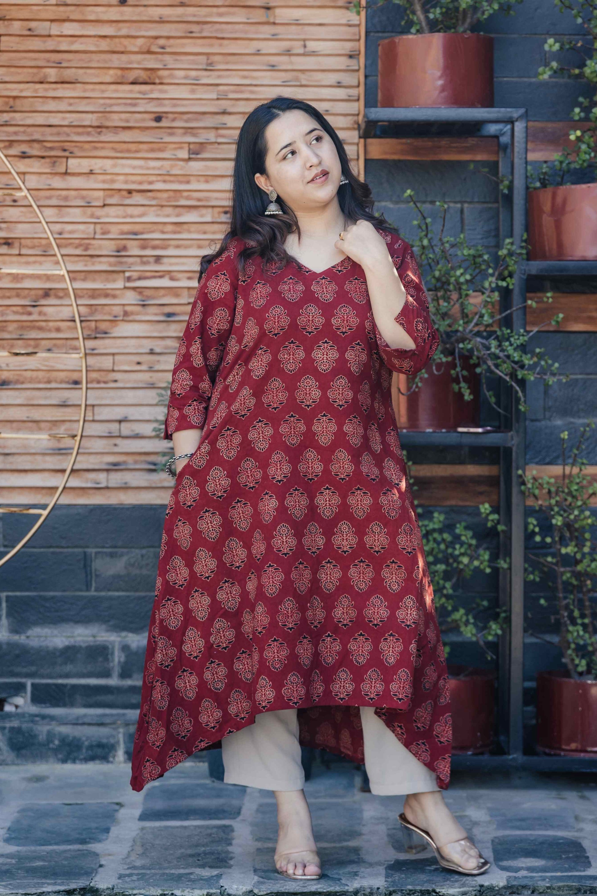 Heritage reimagined. This Ajrakh Blockprinted A-line Kurta blends centuries-old artistry with delicate floral motifs. Handcrafted on soft, breathable fabric, its flowing silhouette brings timeless charm to modern dressing.