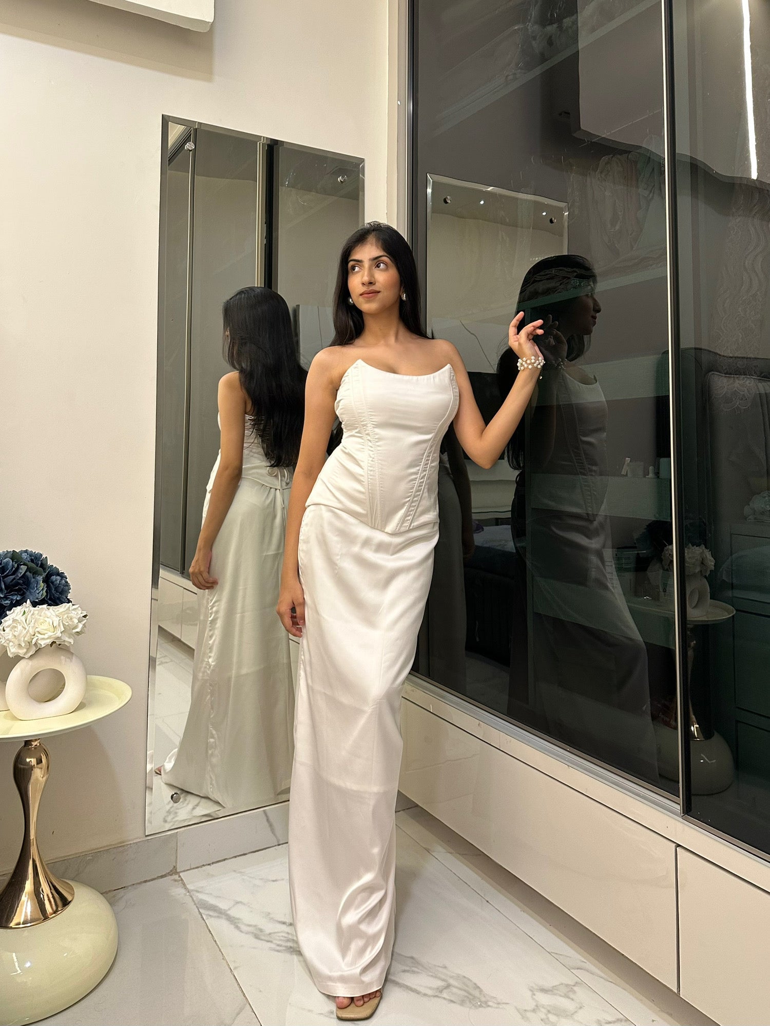 Turn heads in the Monica Royal Satin Corset Set — a stunning blend of structure and fluidity designed to celebrate your silhouette. Crafted in luxe satin with a soft sheen, the set features a sculpted corset top with defined paneling and a flattering neckline, paired with a sleek, floor-grazing skirt for an effortlessly elegant look.