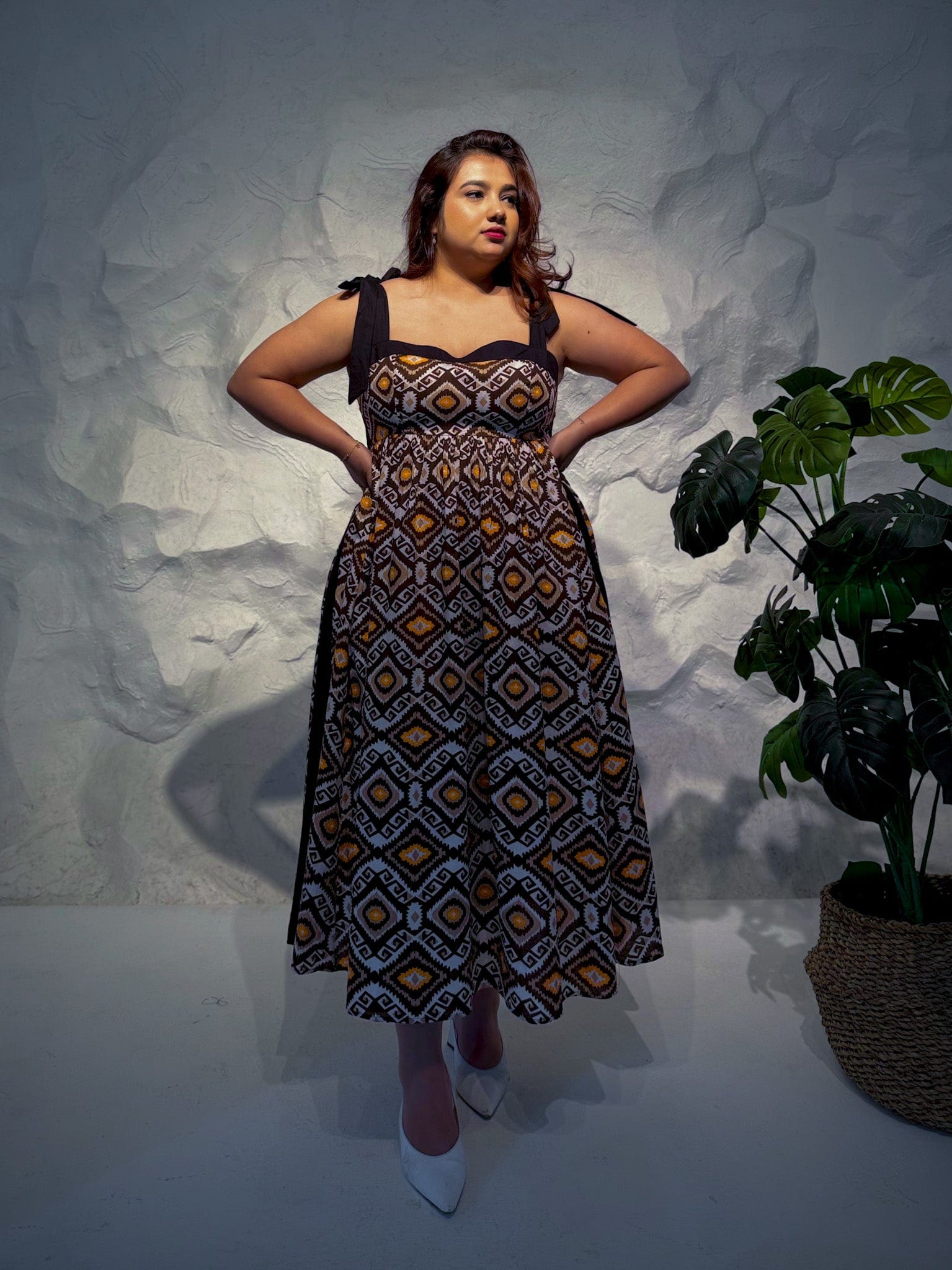 A striking printed midi dress crafted in breathable cotton, featuring wide self-tie shoulder straps and a softly gathered waist for a flattering fit. The bold pattern and easy silhouette make it a perfect day-to-evening piece—stylish, comfortable, and effortlessly chic.