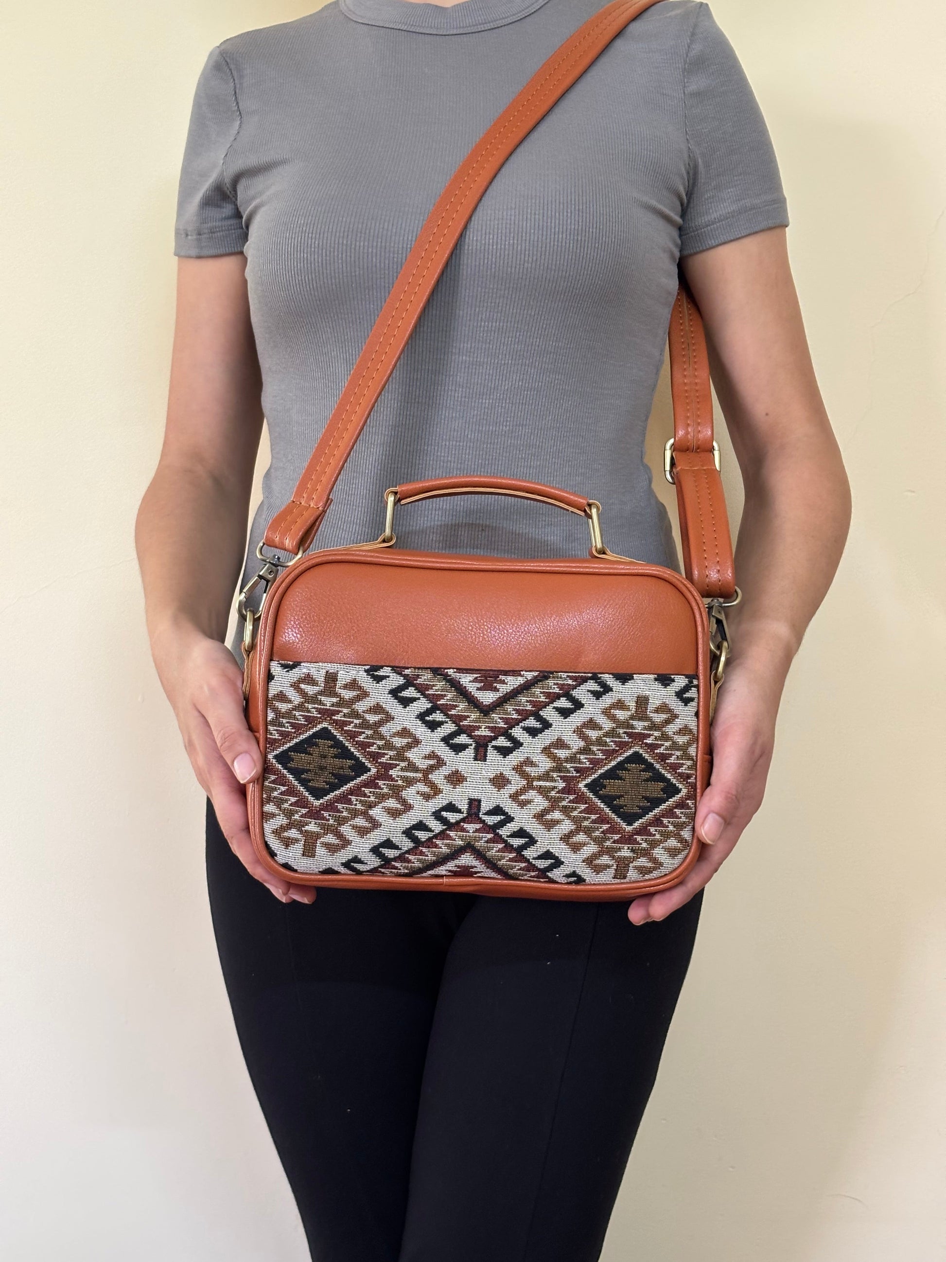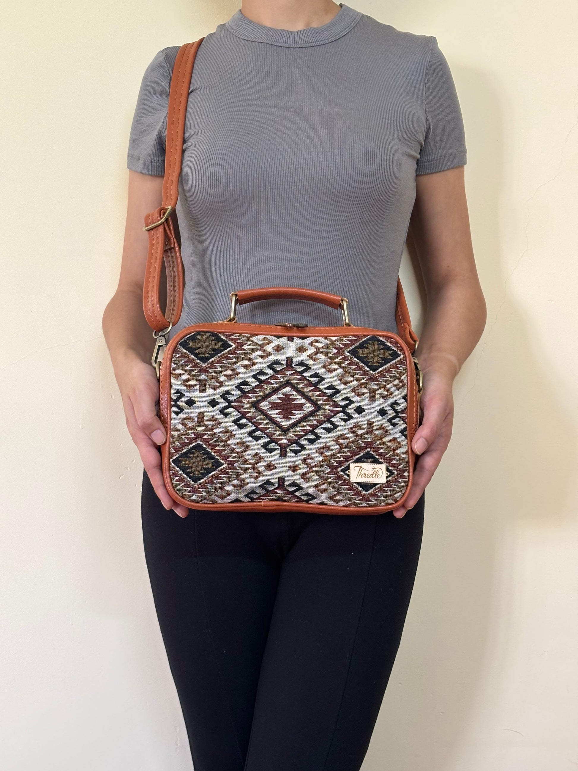 Timeless and versatile, the Nomad Briefcase Sling is handcrafted from premium tribal-patterned woven fabric and tan faux leather. With a top handle, adjustable sling, and smart storage pockets, it’s built for work, travel, and everyday ease — all with a touch of global charm.