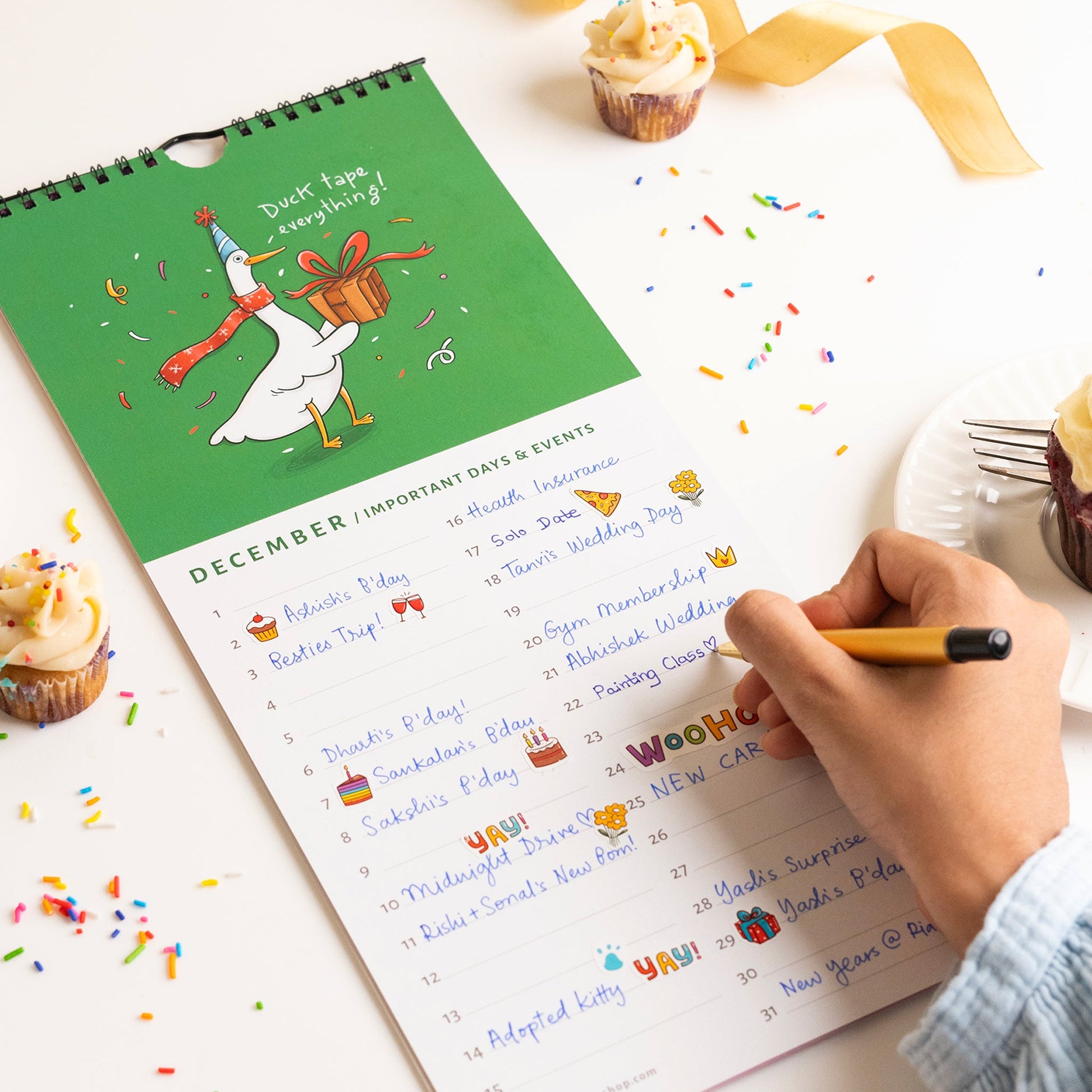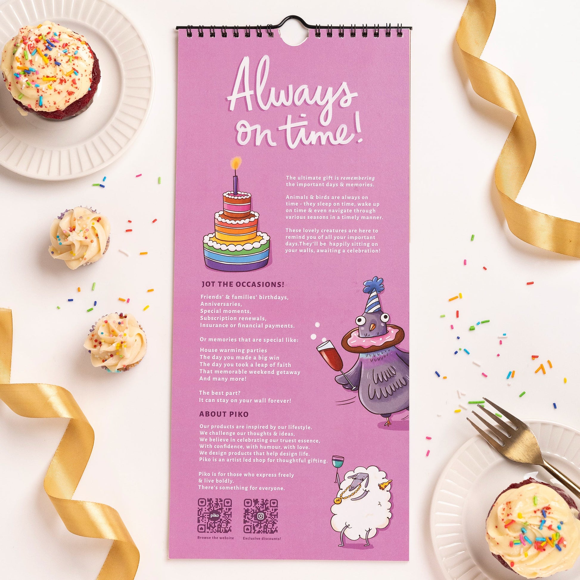 The ultimate gift is remembering the important days & memories. These lovely creatures are here to remind you of all your important days. They'll be happily sitting on your walls, awaiting a celebration! Jot down the occasions like friends & families birthdays, anniversaries, special moments, subscription renewals, insurance or financial payments or memories that are special like house warming parties, day you made a big win, day you took a leap of faith, memorable weekend getaway and many more! The best part? It can stay on your wall forever with over 120+ celebration stickers! The calendar interior comes with list view, dates that can be used perpetually!