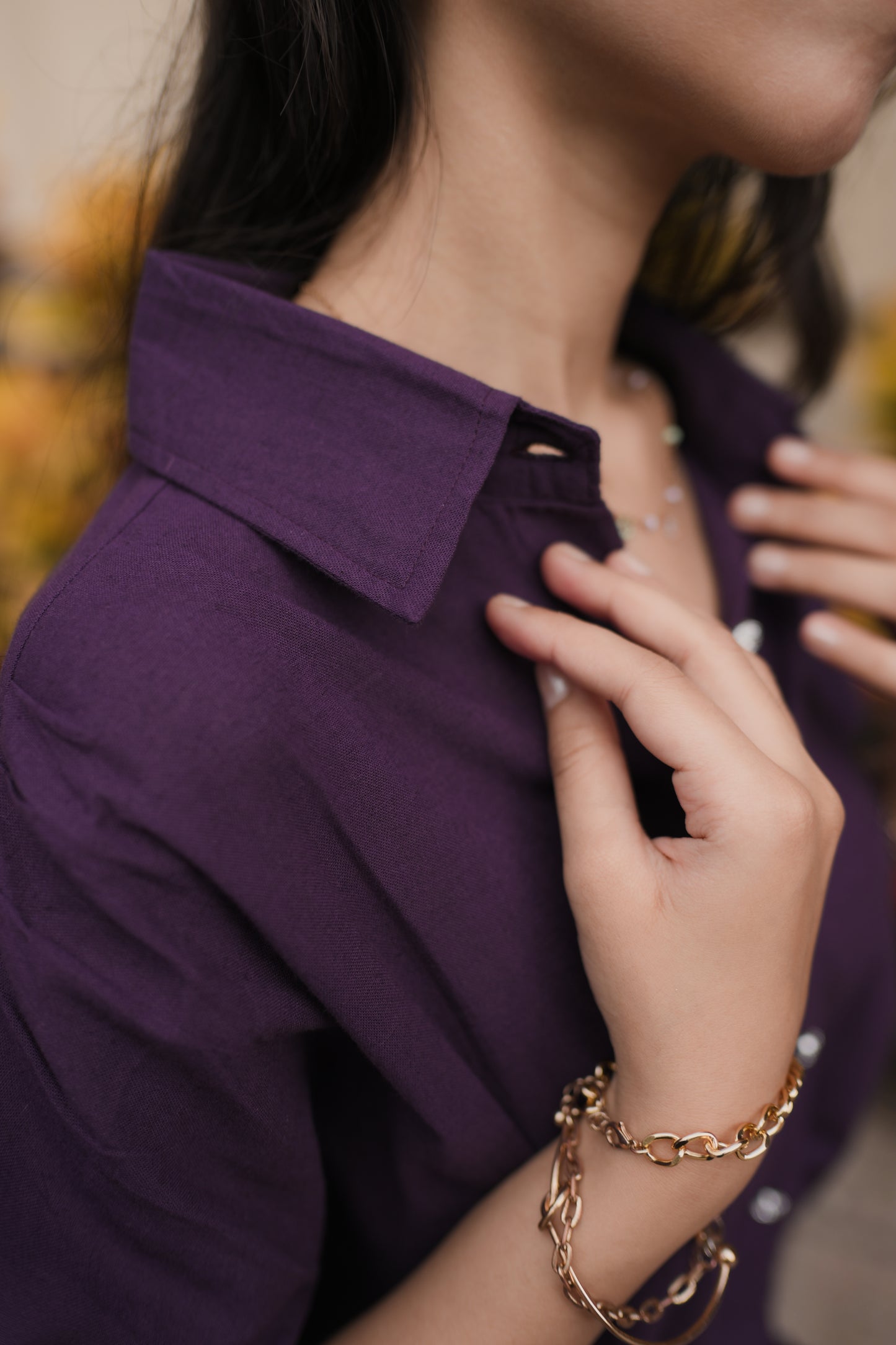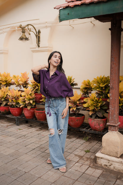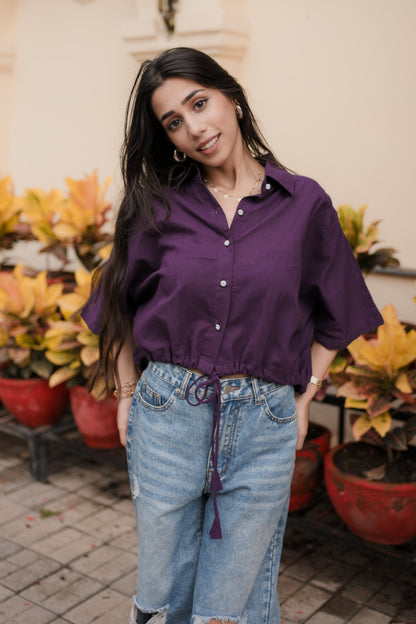 Bold yet effortlessly chic, the Plum Pop Cotton Drawstring Shirt features a rich plum hue, soft breathable cotton, and a relaxed drop-shoulder fit. With a button-down front and adjustable drawstring hem, it's perfect for layering or standout solo style.