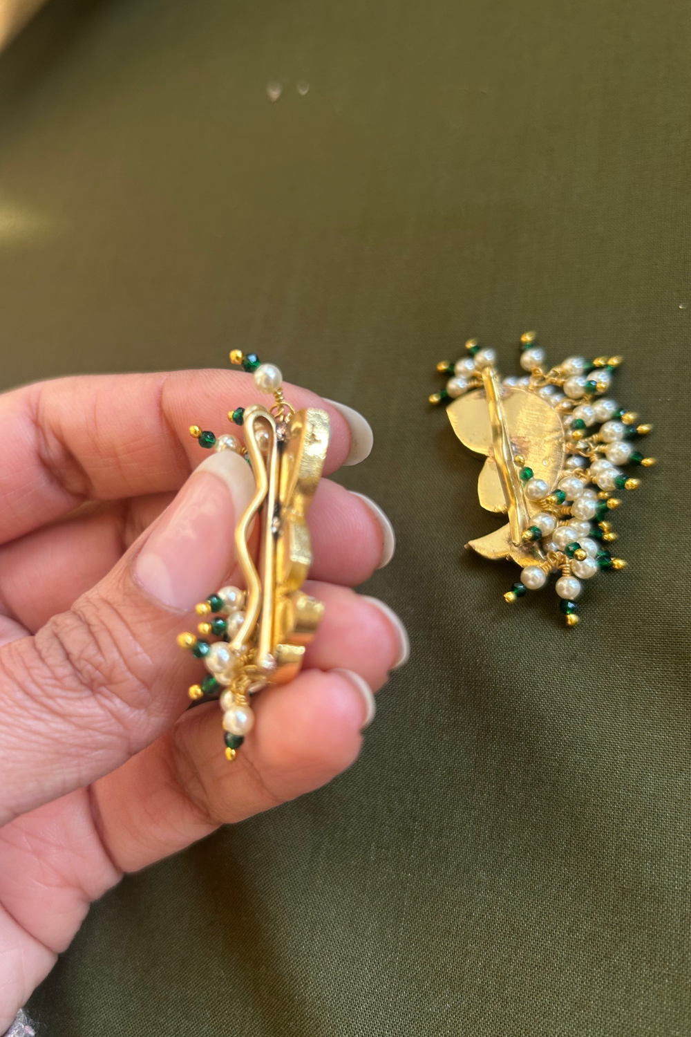Playful yet regal, these red fish hair clips are crafted in a mosaic of ruby-toned stones and polki accents, set in a graceful fish silhouette. The edges are adorned with cascading clusters of pearls and tiny green bead drops, adding movement and charm. A whimsical addition to festive hairstyles, these clips celebrate tradition with a touch of fun and opulence.
