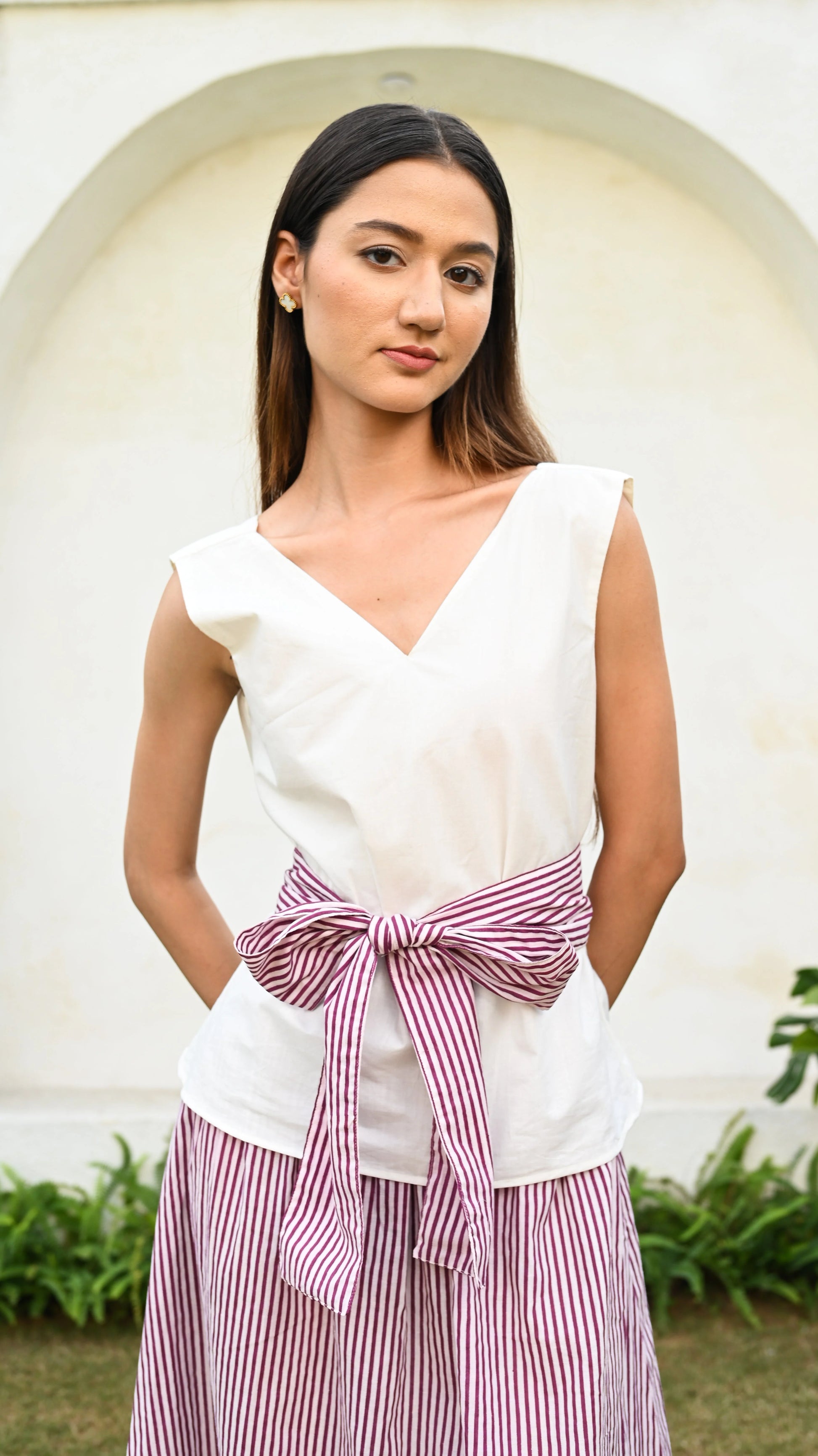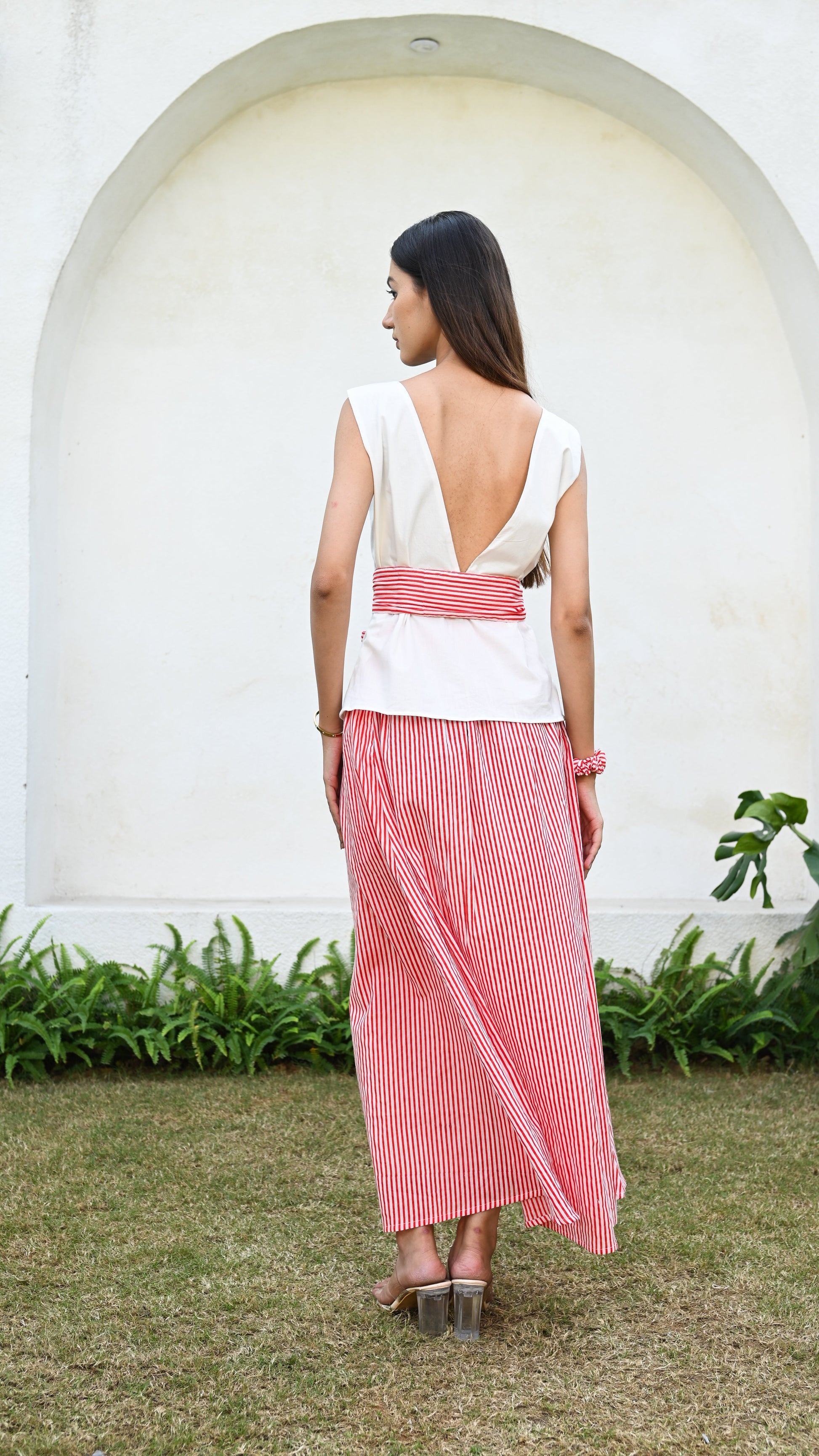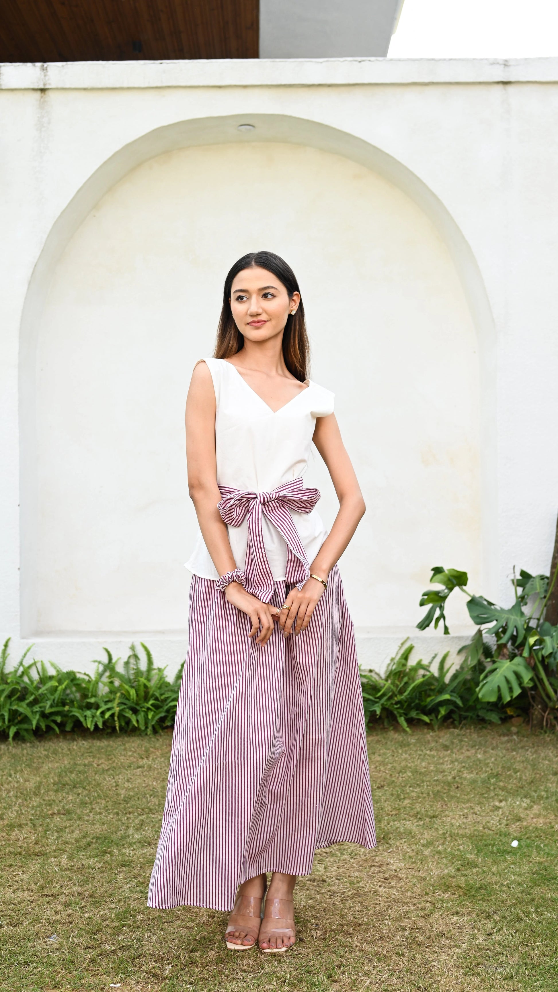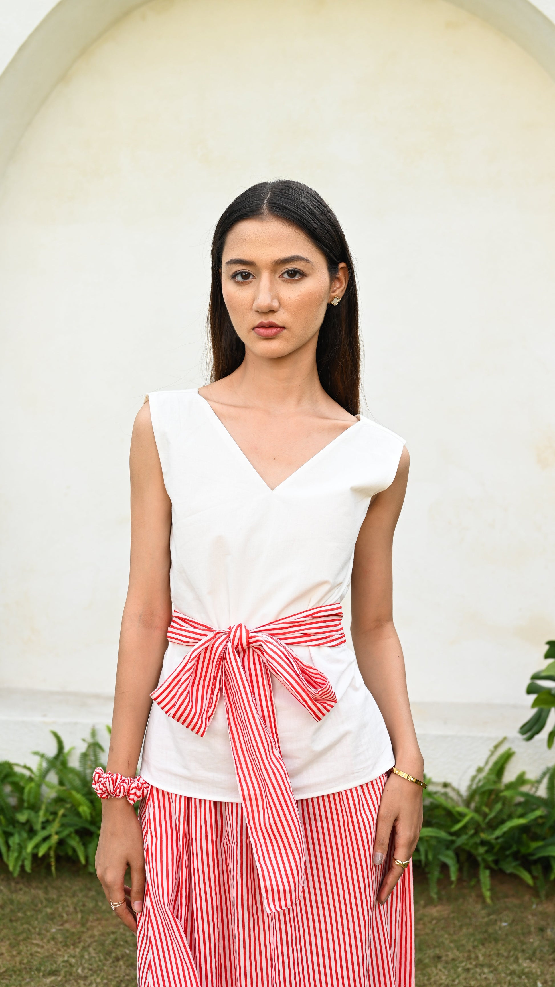 Chic and refreshing, this 3-piece summer set is perfect for warm-weather styling. Featuring a crisp white top, a red and white striped skirt, and a self-tie belt that forms a charming bow, this ensemble offers effortless elegance and versatile wear for sunny days and casual occasions.