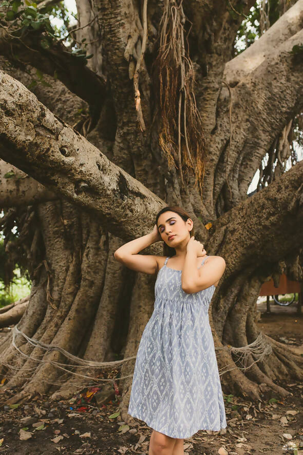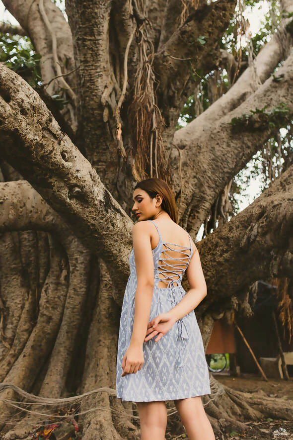 Palat, palat, palat! Be as filmy as you can wearing this dress with an irresistible back detailing This cotton dress has intricate diamond pattern block printed on it to give it an edge, while being super comfortable to carry.